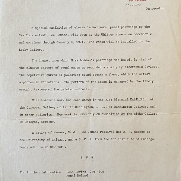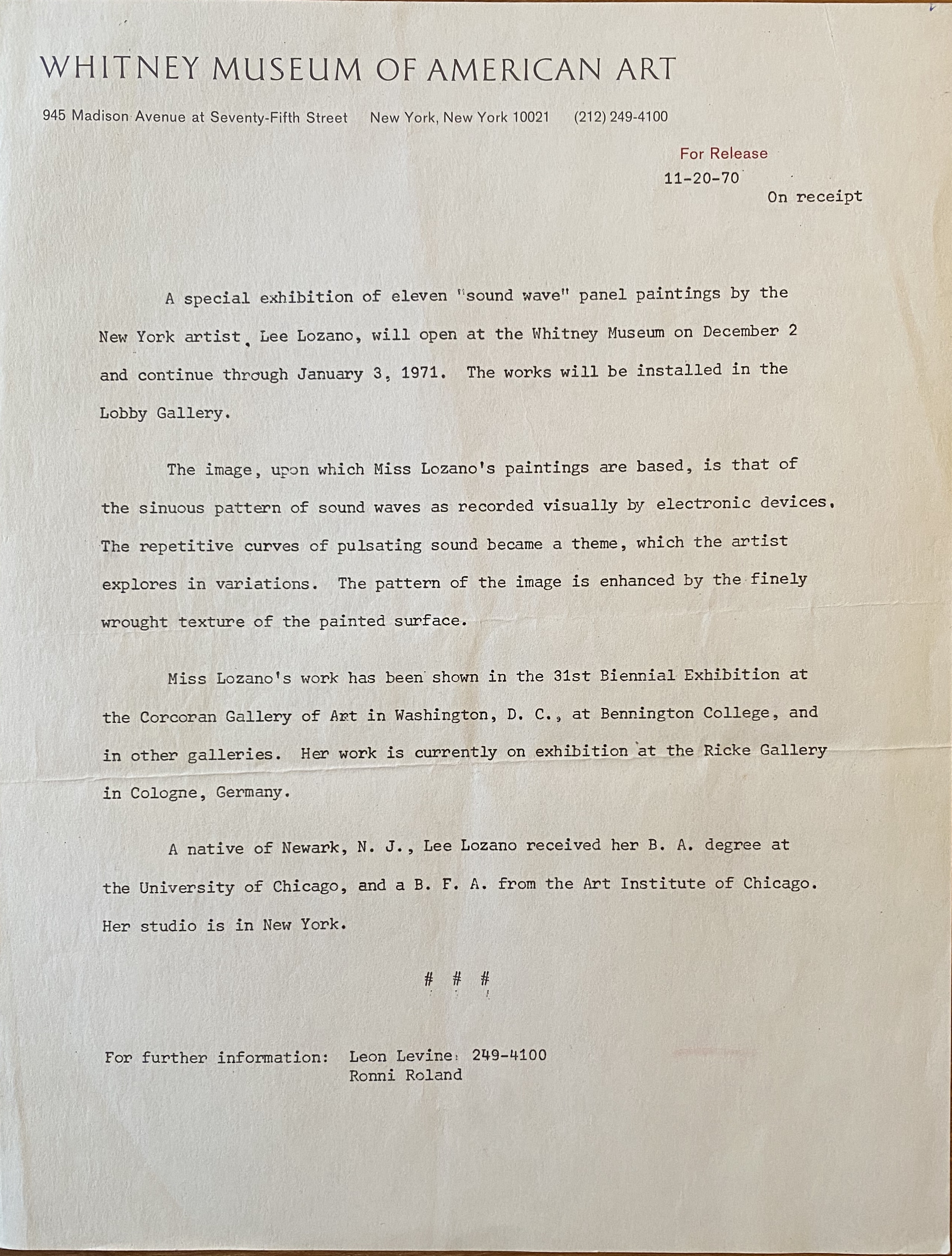 (Lee Lozano). Whitney Museum of American Art, New York, November 20, 1970