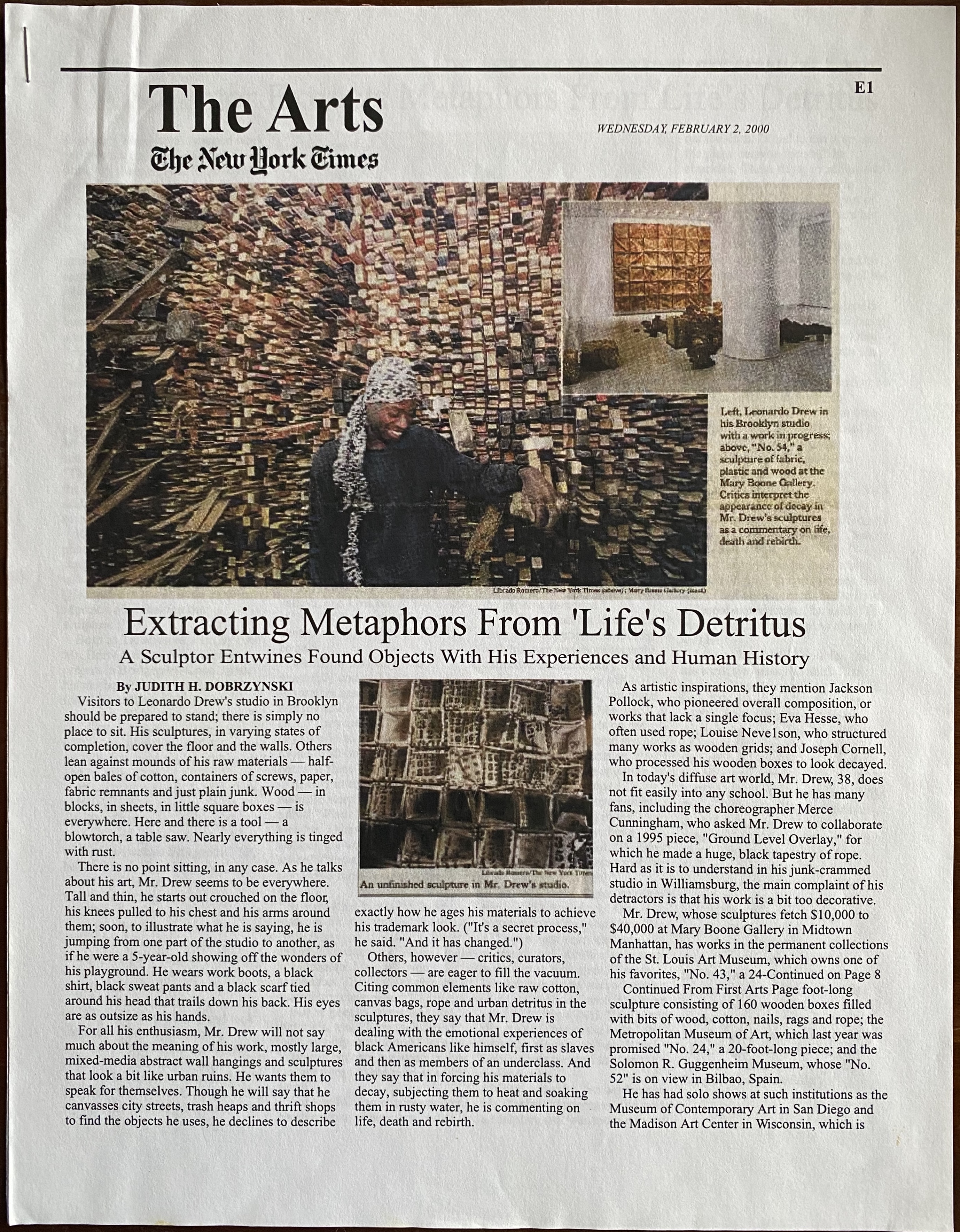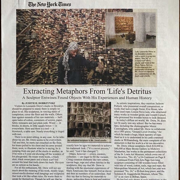 (Leonardo Drew). Judith H. Dobrzynski. Extracting Metaphors From Life’s Detritus. The New York Times, February 2, 2000