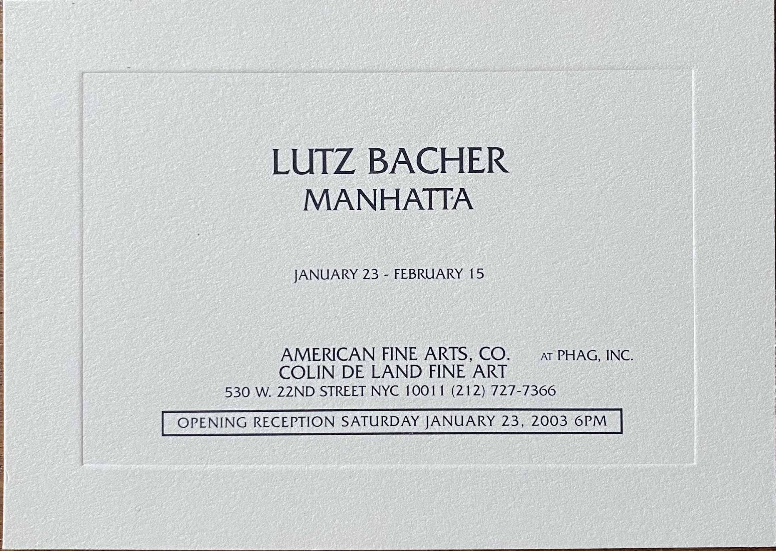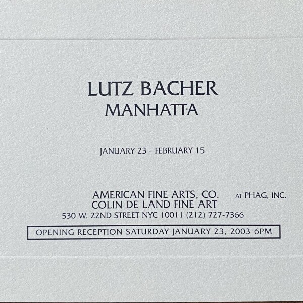 Lutz Bacher. Manhatta. American Fine Arts, Co. / Colin de Land Fine Art, New York, January 23 – February 15, 2003