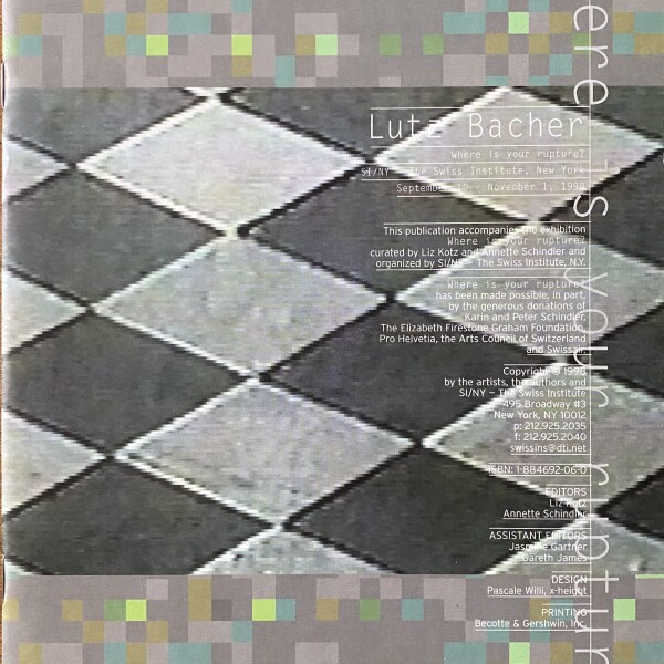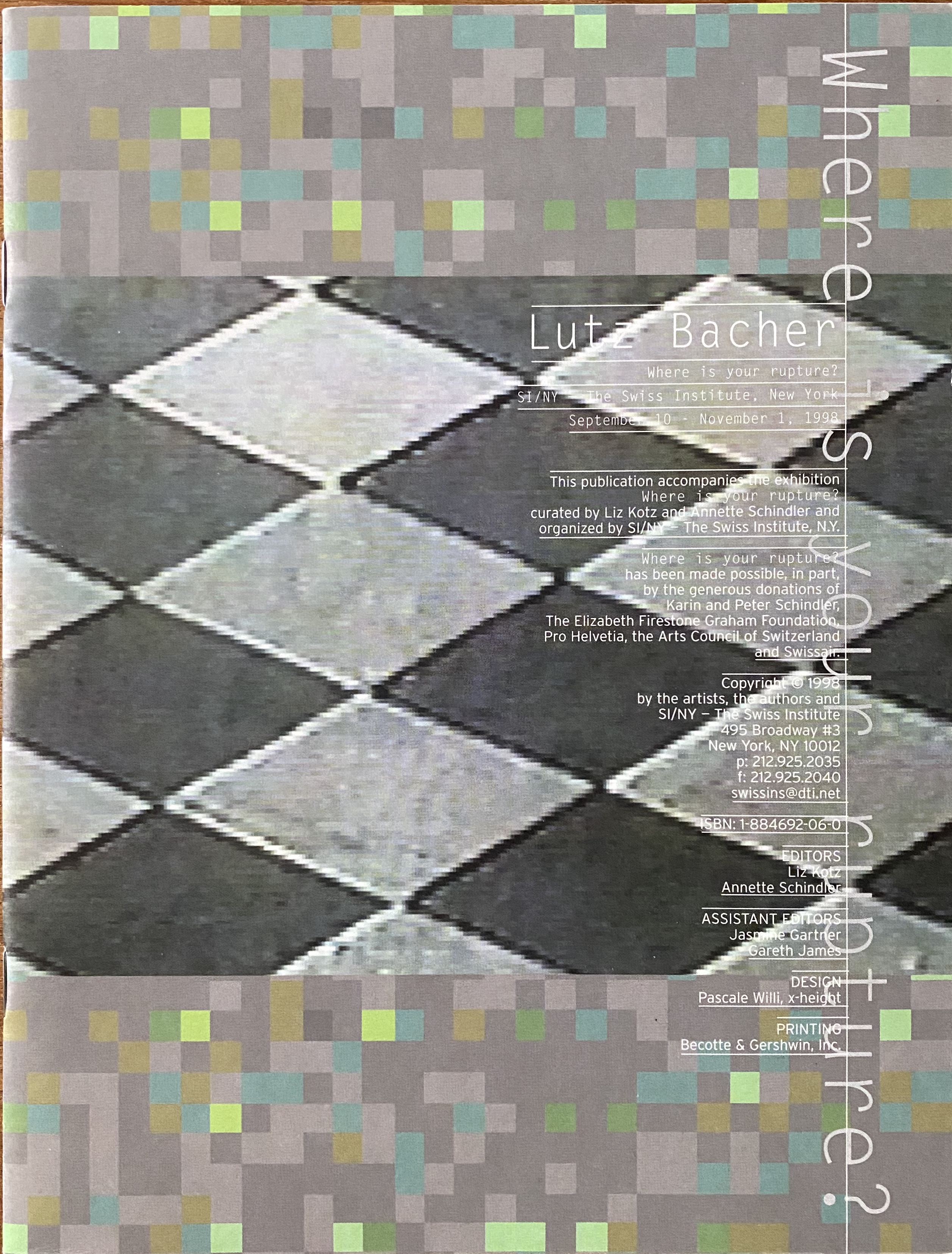 Lutz Bacher. Where is your rupture? Swiss Institute, New York, September 10 – November 1, 1998