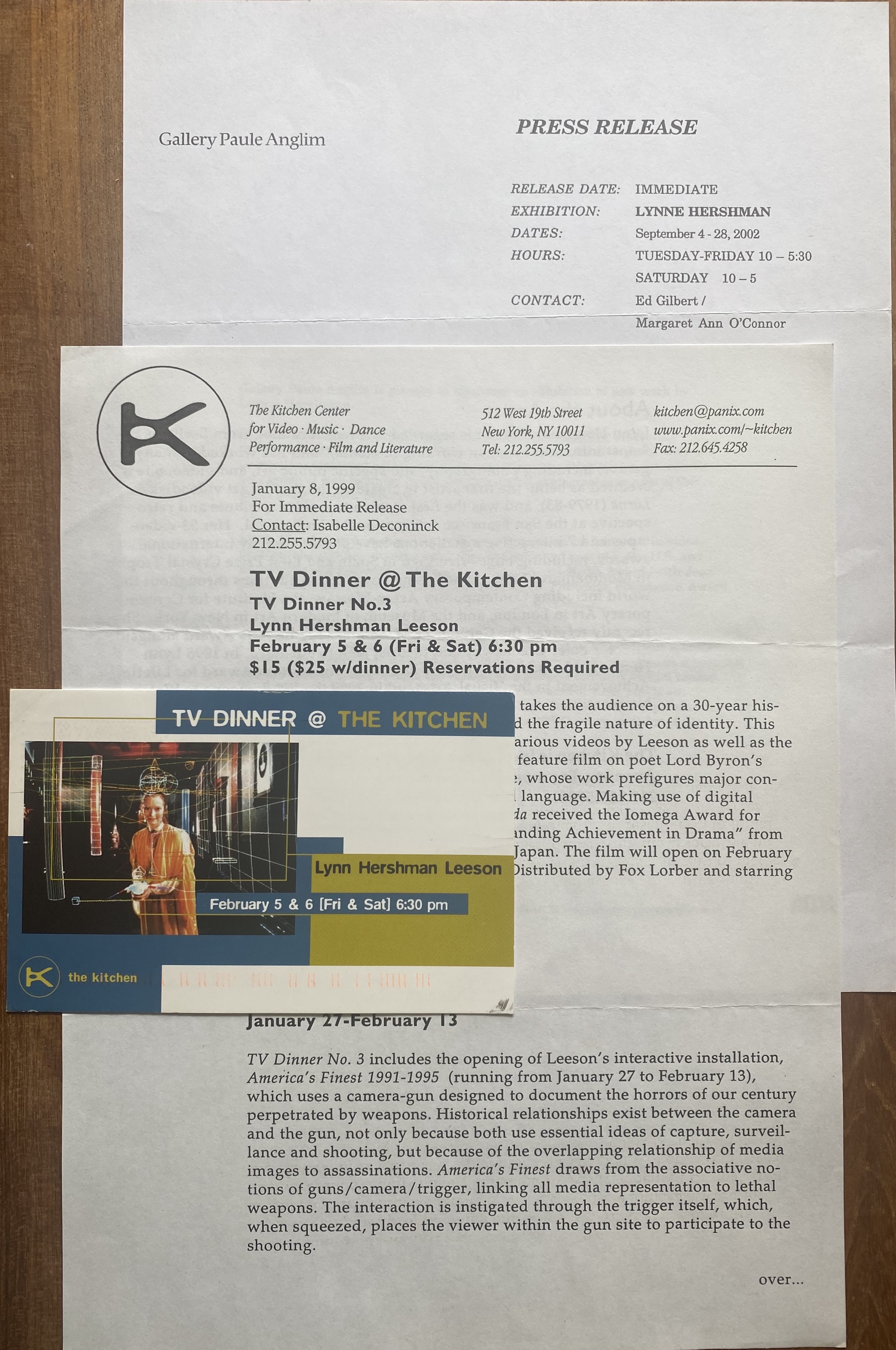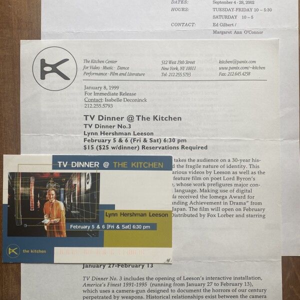 (Lynn Hershman Leeson). TV Dinner No. 3. The Kitchen, New York, February 5, 6, [1999]. (TV Dinner @ The Kitchen / America’s Finest 1991-1995. The Kitchen Art Gallery, January 27 – February 13, [1999]