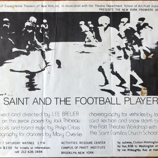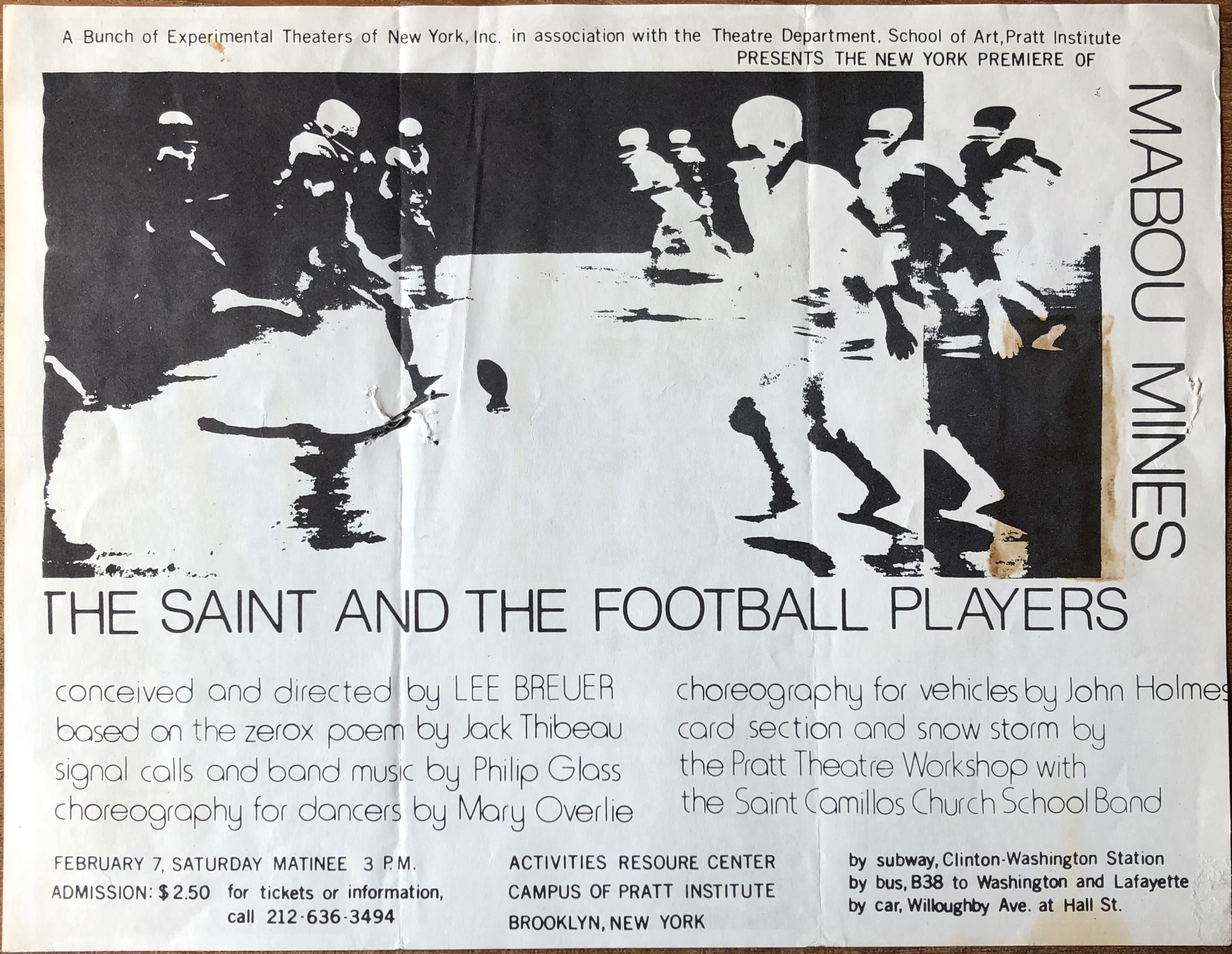 Mabou Mines. The Saint and the Football Players. Conceived and directed by Lee Breuer, based on the Xerox poem by Jack Thibeau. Signal calls and band music by Philip Glass. Activities Resource Center, Campus of Pratt Institute, Brooklyn, New York, February 7, [1974]