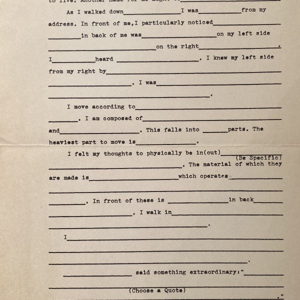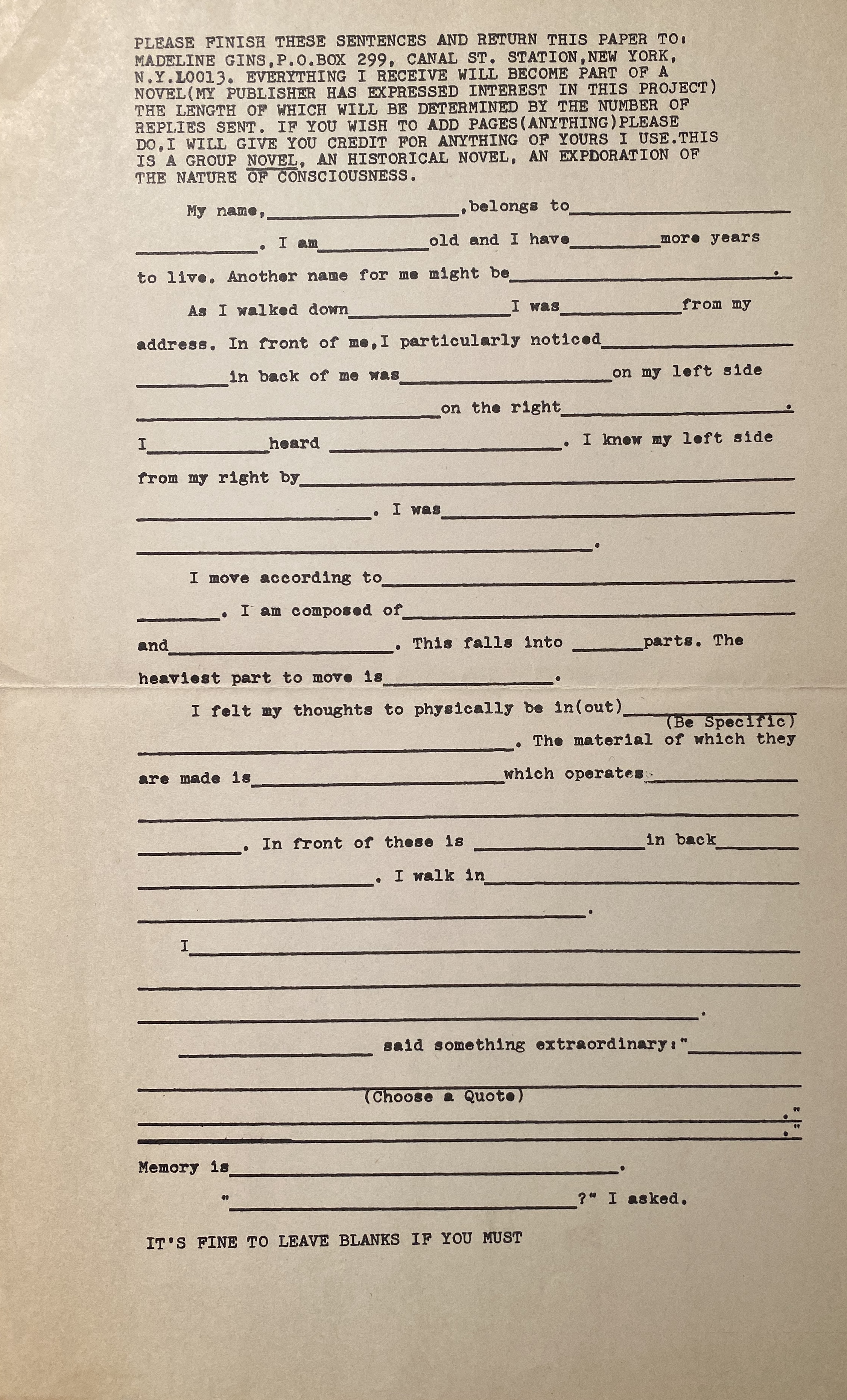 Madeline Gins. A form to be completed towards a “group novel,” distributed as part of Spring 1969 street work events