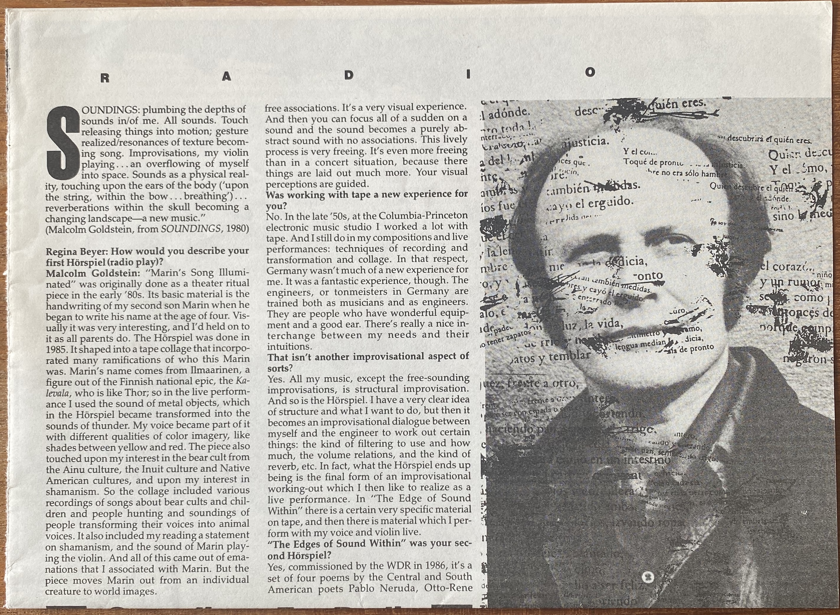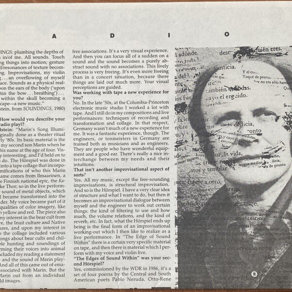 (Malcolm Goldstein). Soundings For Radio: Malcolm Goldstein. Interview by Regina Beyer. Ear Magazine for New Music, volume 13/#5. New York: Ear, Inc., July/August 1988