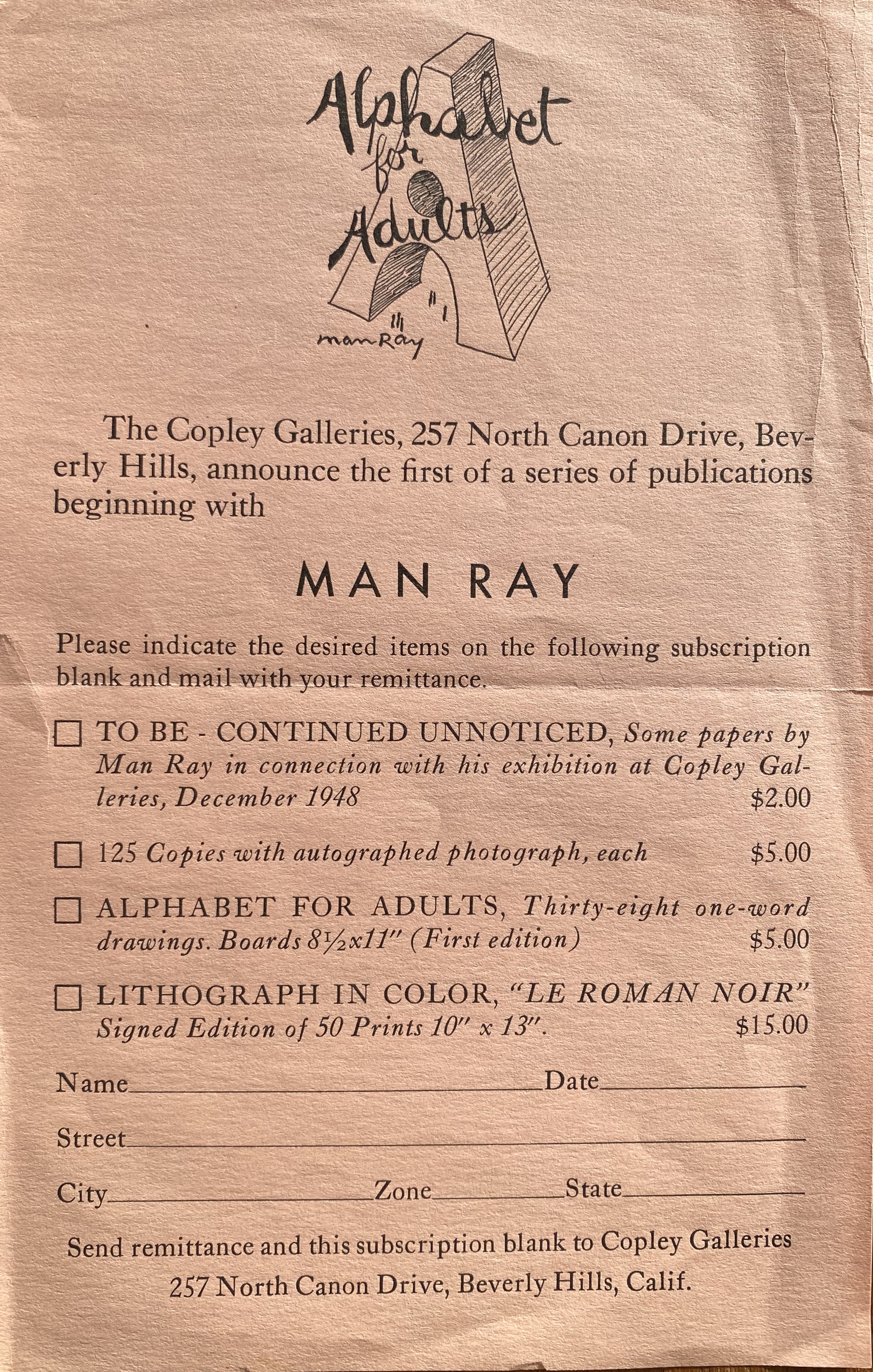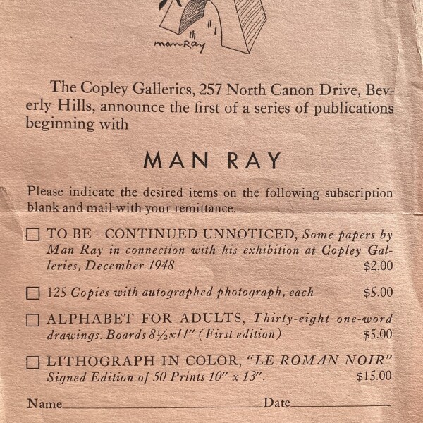 (Man Ray). The Copley Galleries…announce the first of a series of publications beginning with Man Ray. [1948]