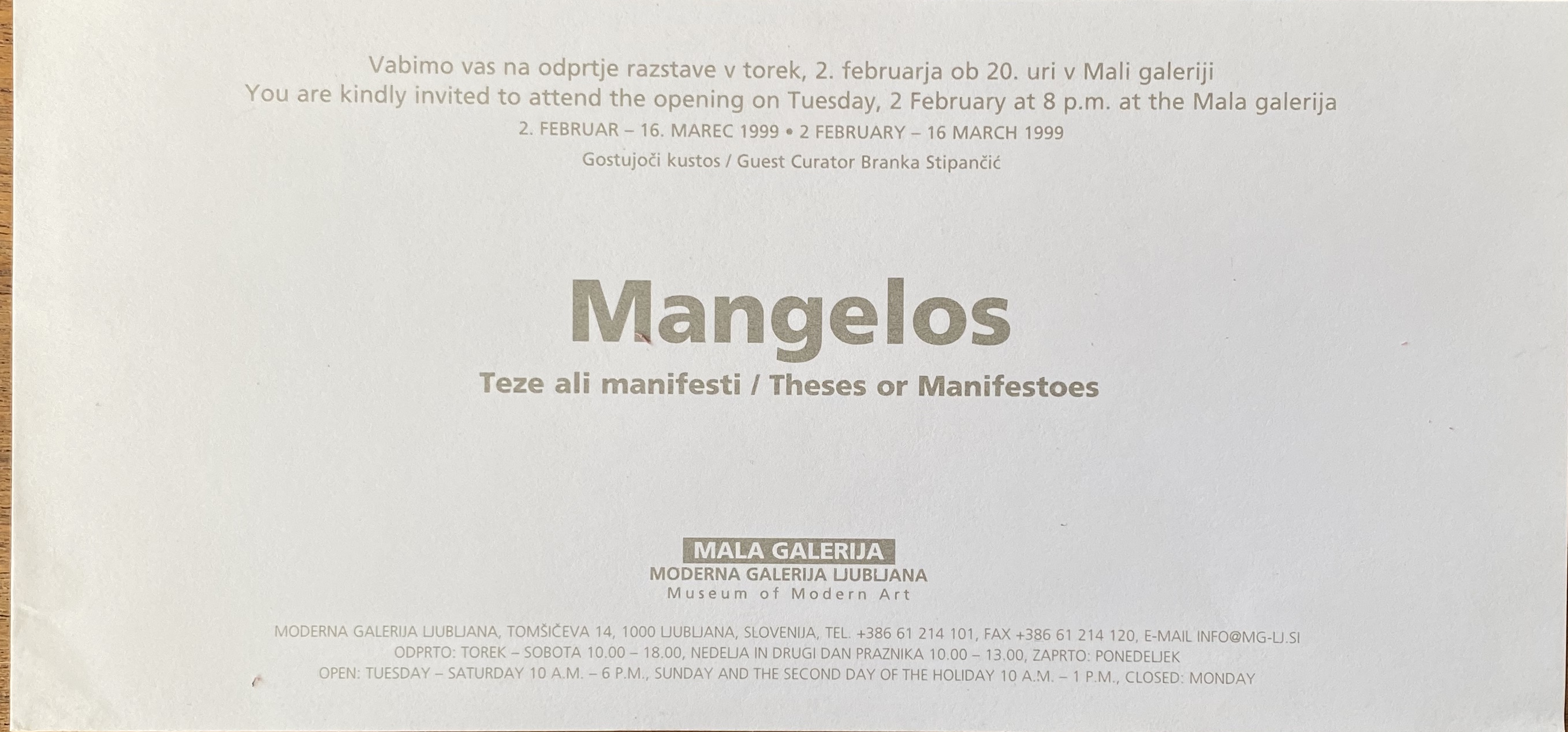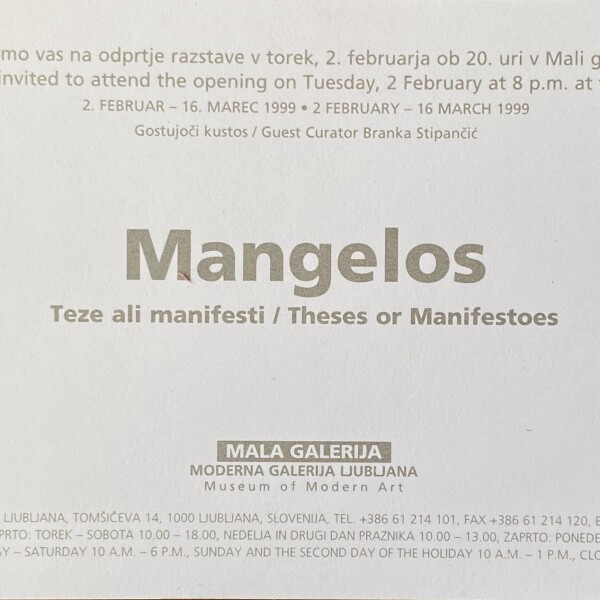 (Mangelos (Dimitrije Bašičević known as).) Teze ali manifesti / Theses or Manifestoes). Mala Galerija, Ljubljana, 2 February – 16 March 1999