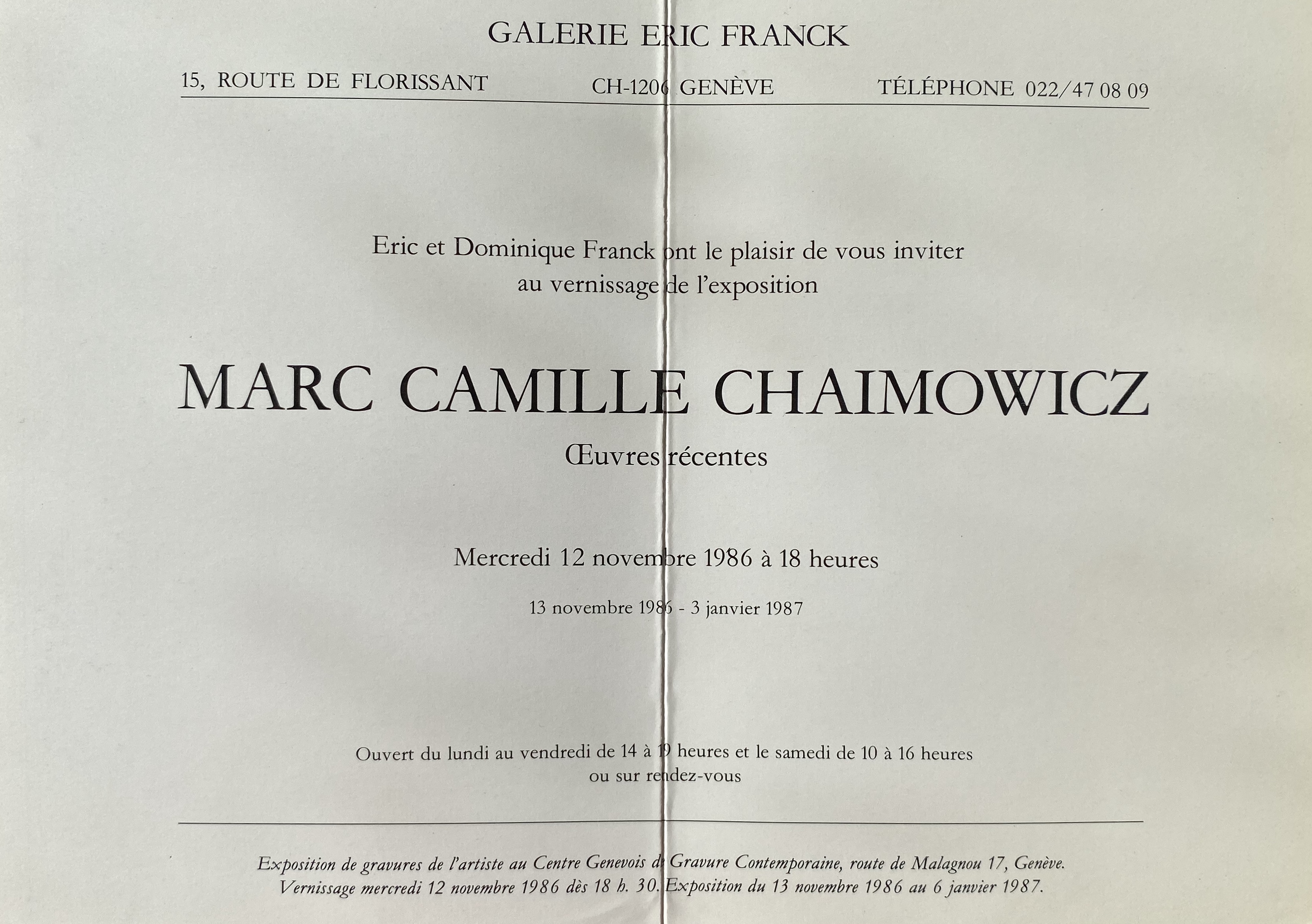 Marc Camille Chaimowicz. Oeuvres récentes. Galerie Eric Franck, Genève, 12, 13 novembre 1986 – 3 janvier 1987