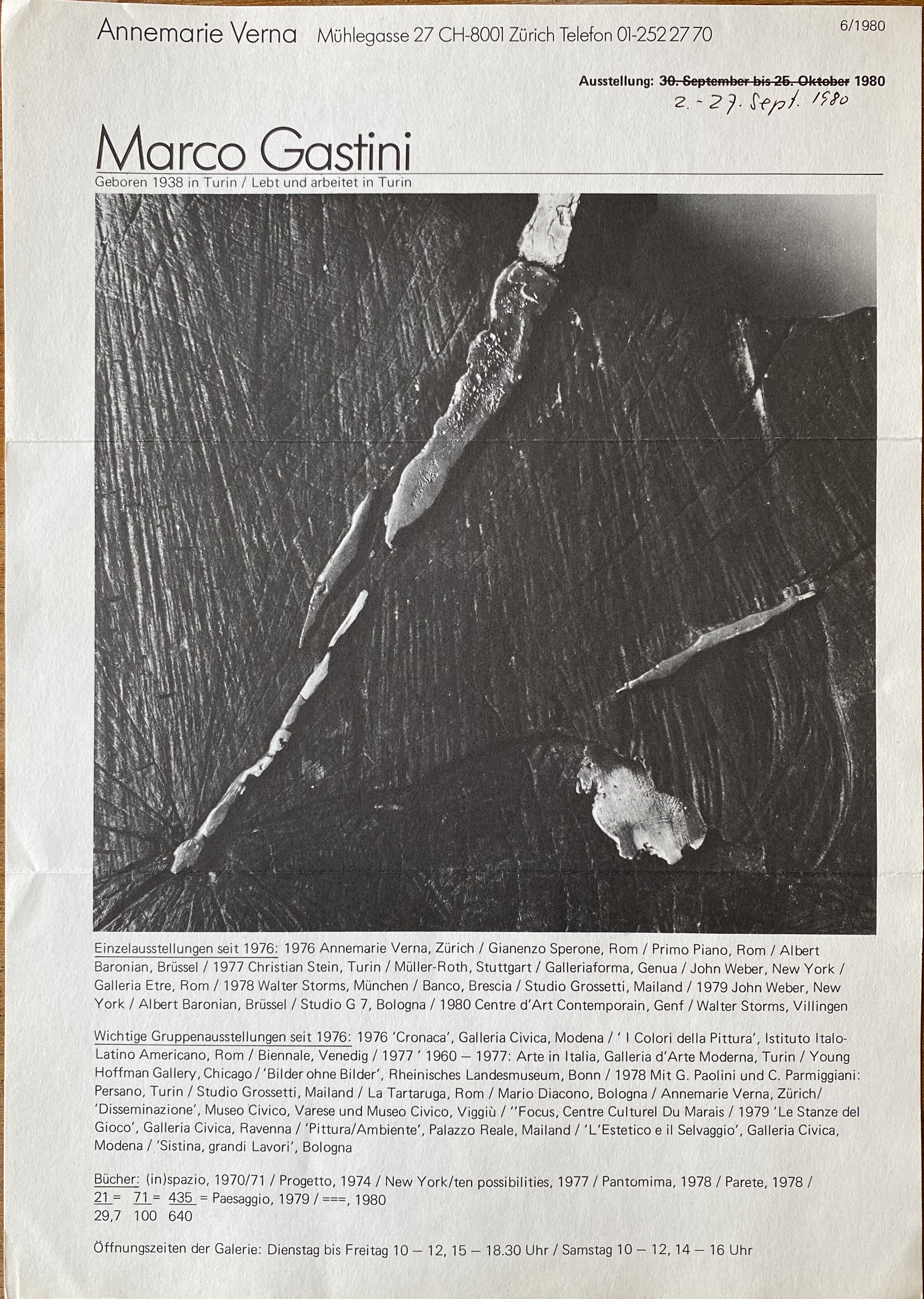 (Marco Gastini). Marco Gastini. Annemarie Verna, Zürich, 2-27 September 1980. (6/1980)