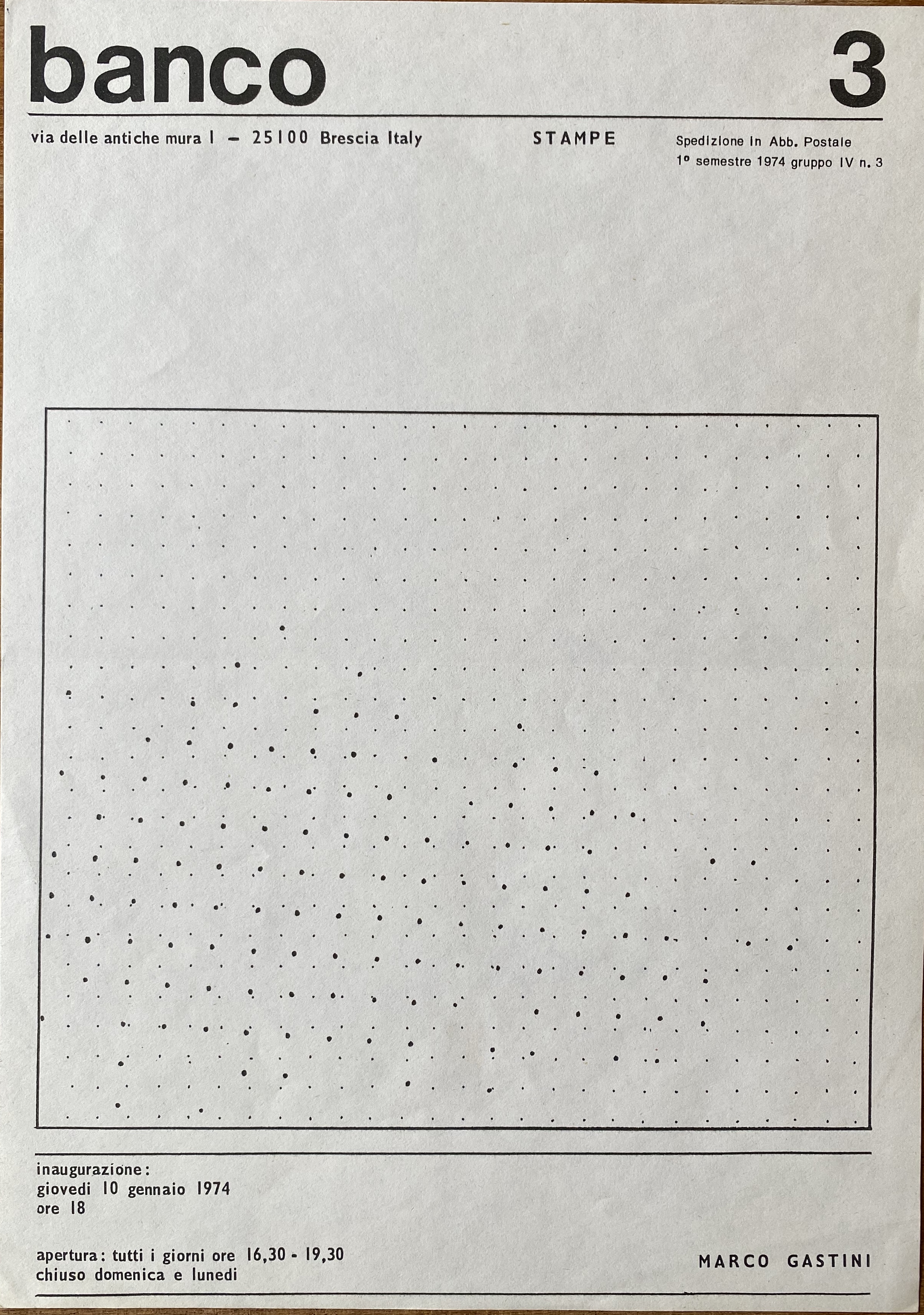 (Marco Gastini). Marco Gastini. Banco, Brescia, 10 gennaio 1974. (3) 1 page 11-3/8 x 8-1/16″ / 28.8 x 20.4cm