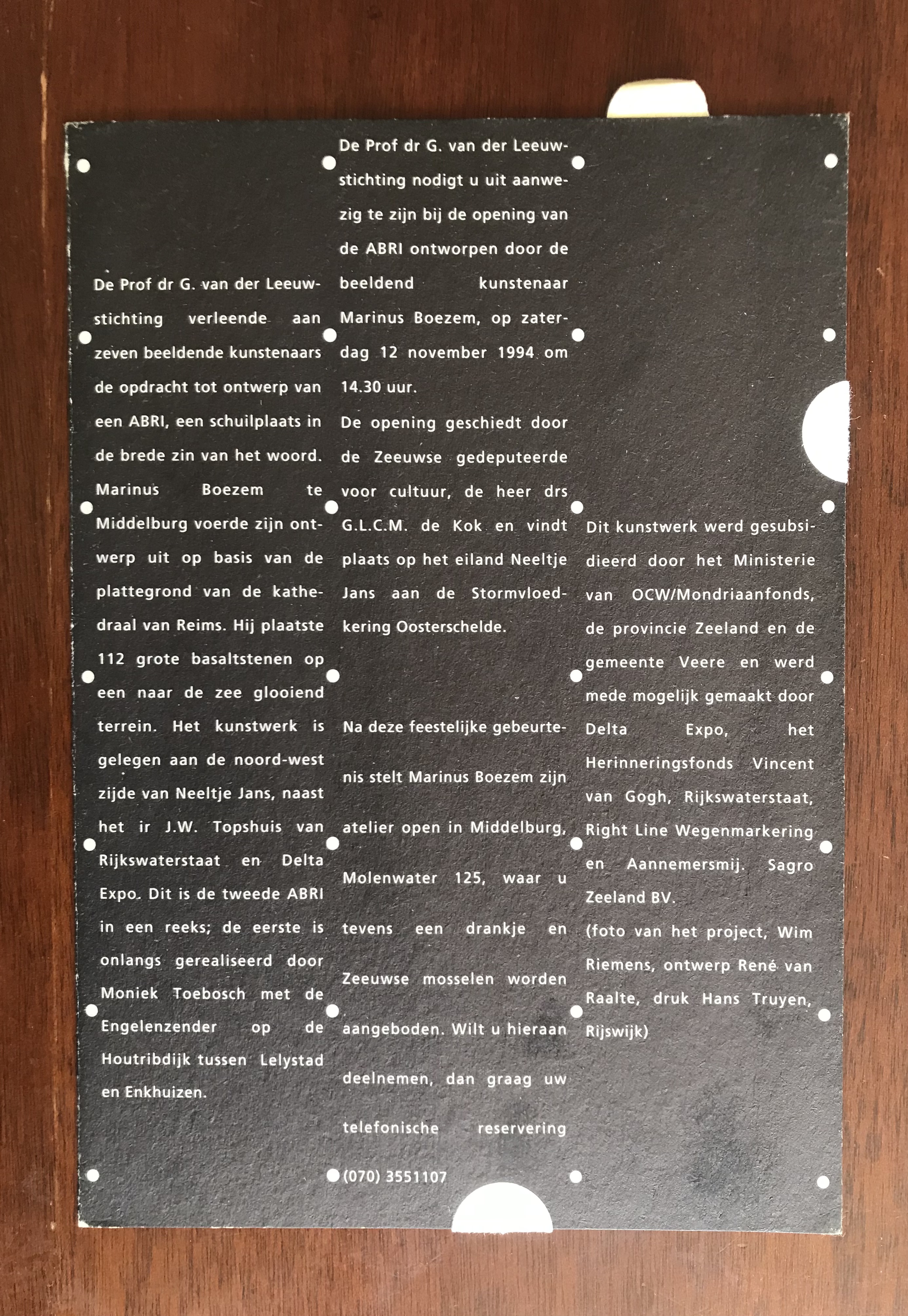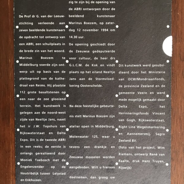 (Marinus Boezem). de Prof dr. G. van der Leuw stichting nordigt u uit aanwazig te zijn bij de opening van de ABRI ontworpen door de beeldend kunstenaar Marinus Boezem, op zaterdag 12 november 1994