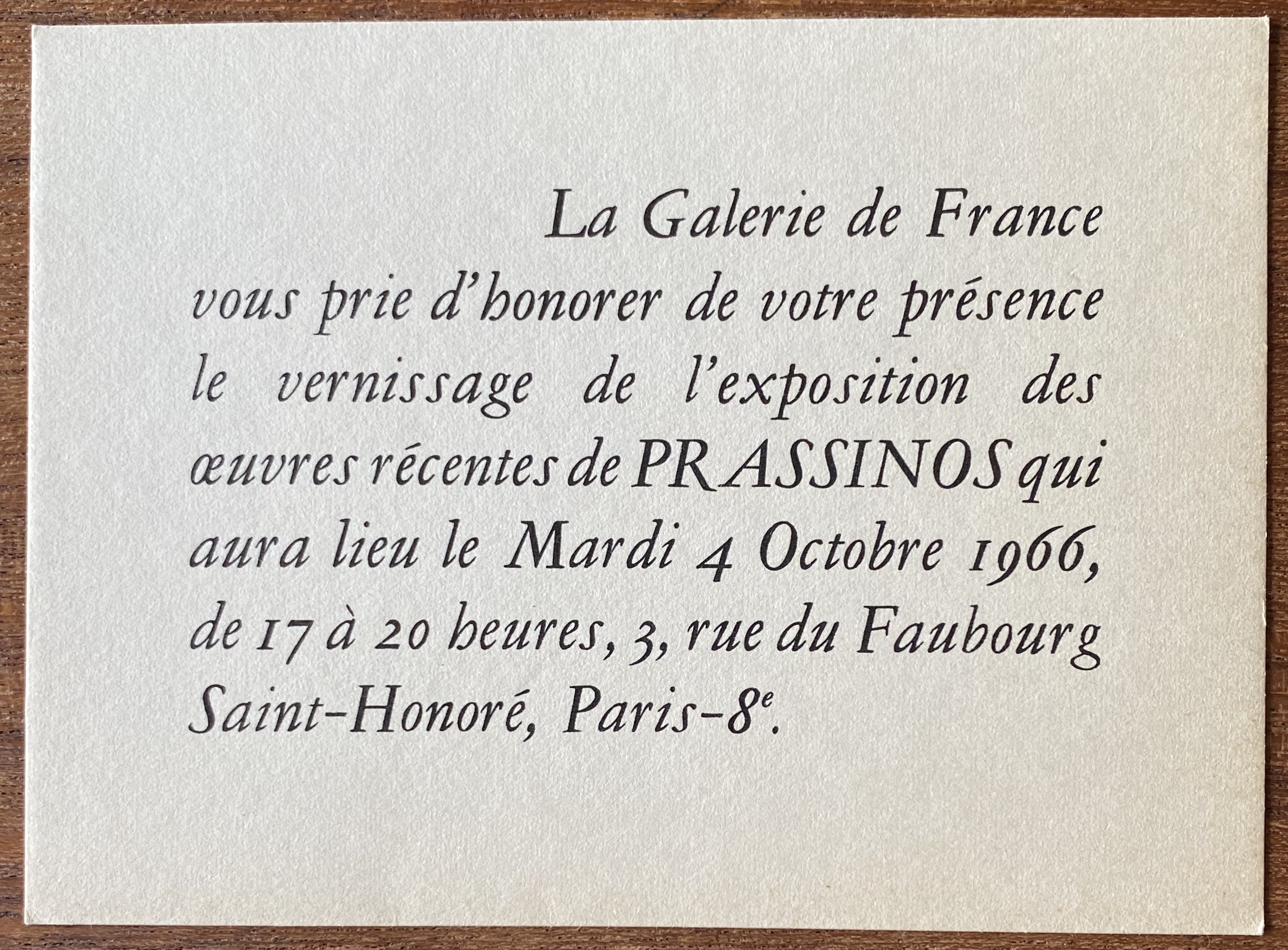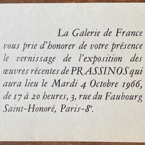 (Mario Prassinos). … exposition des oeuvres récentes de Prassinos. Galerie de France, Paris, 4 octobre 1966
