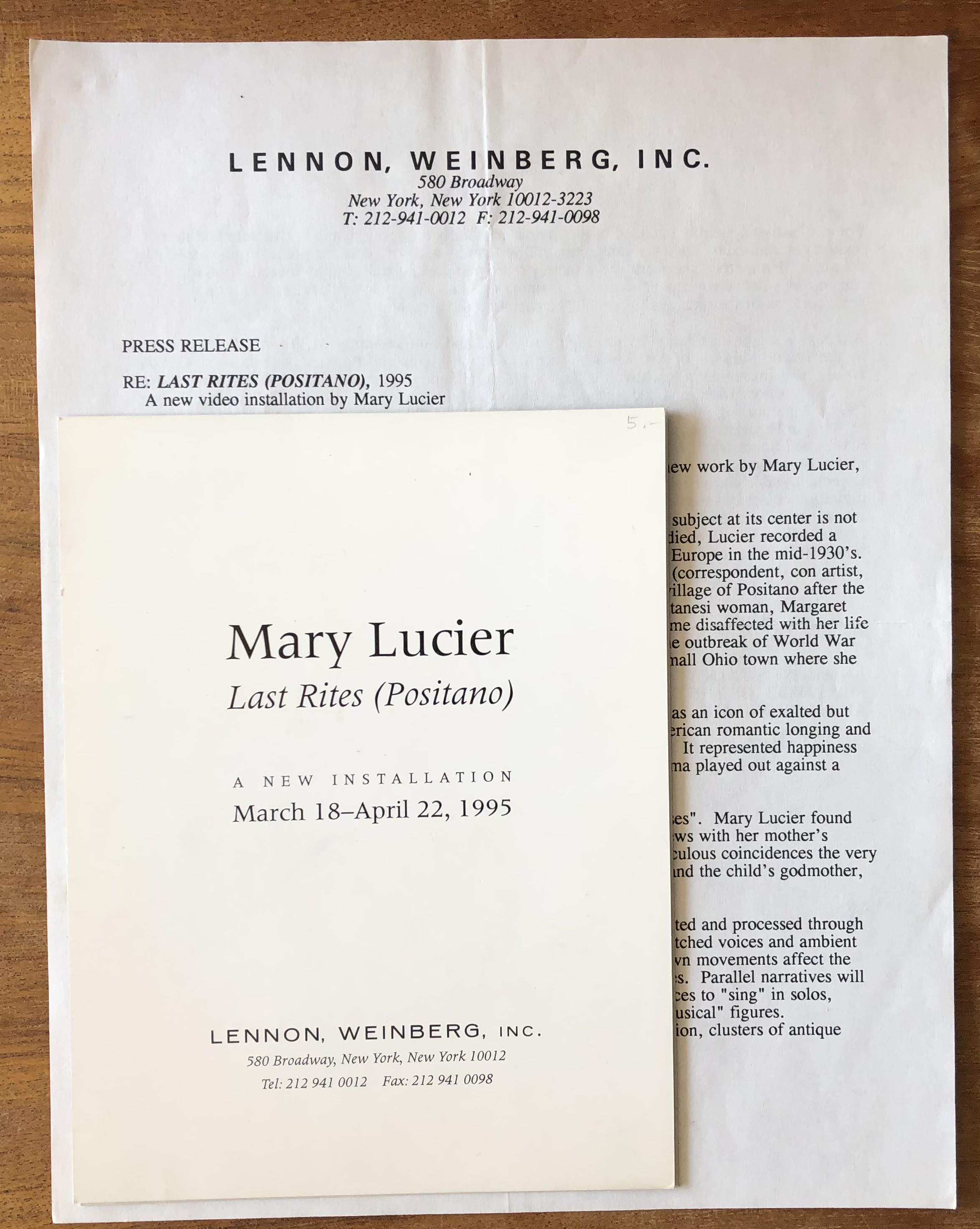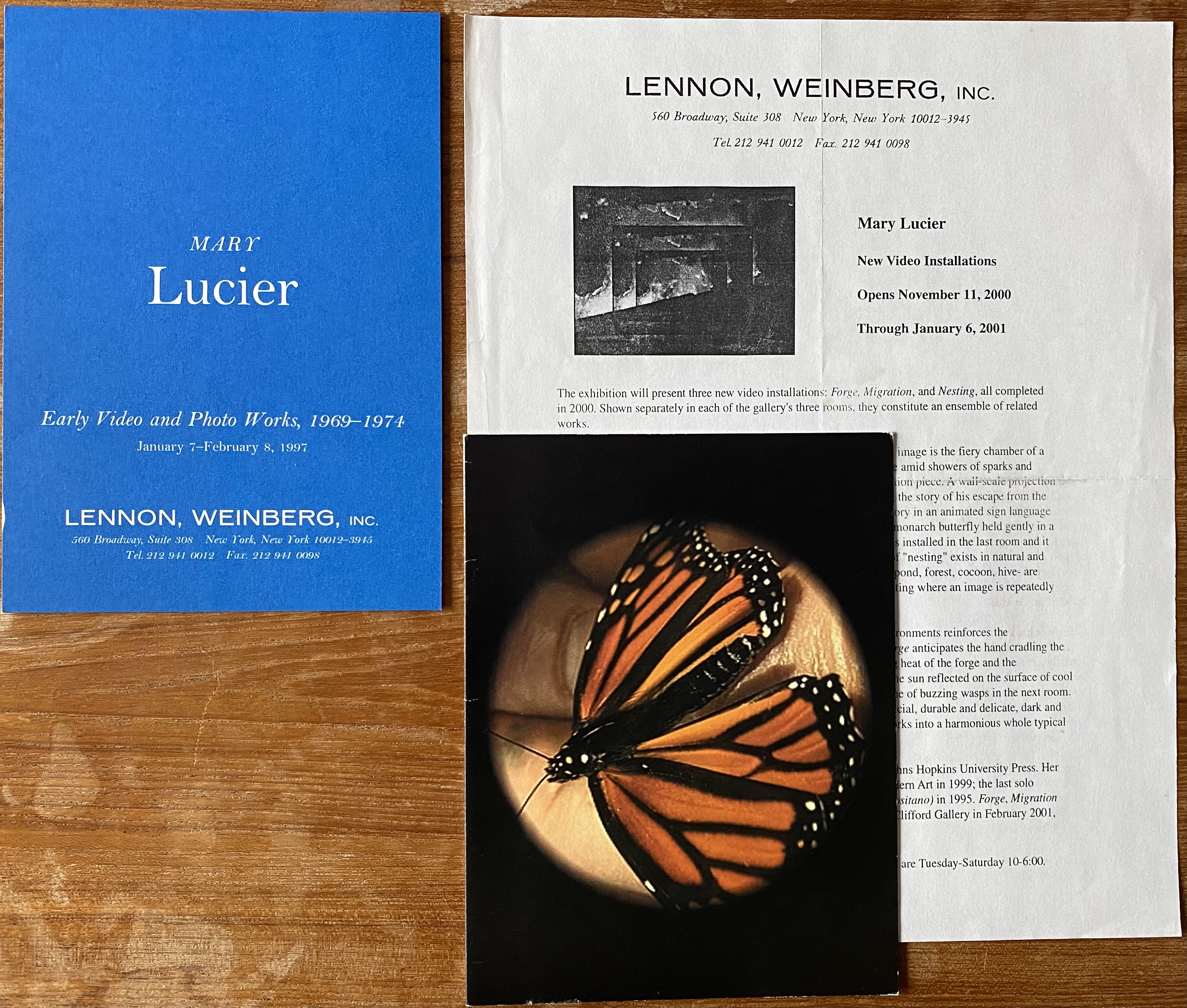 Mary Lucier. 2 announcement cards, 1 folded card and 3 press-releases. Lennon Weinberg, New York, 1995 – 2007