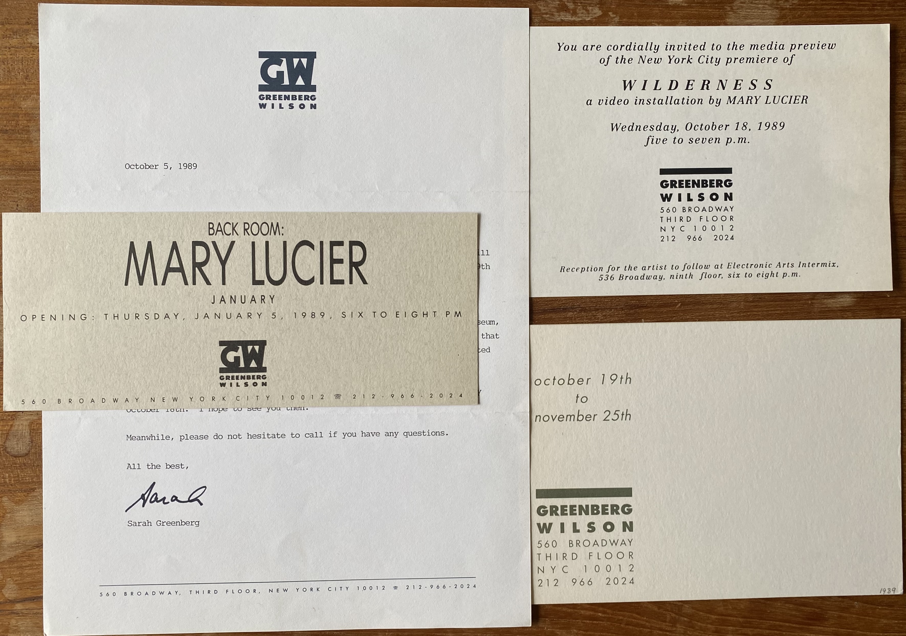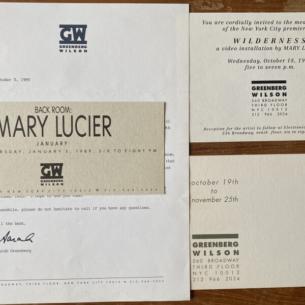 Mary Lucier. 4 cards, 1 review, and 1 press release. Greenberg Wilson, New York, 1989 – 1991.