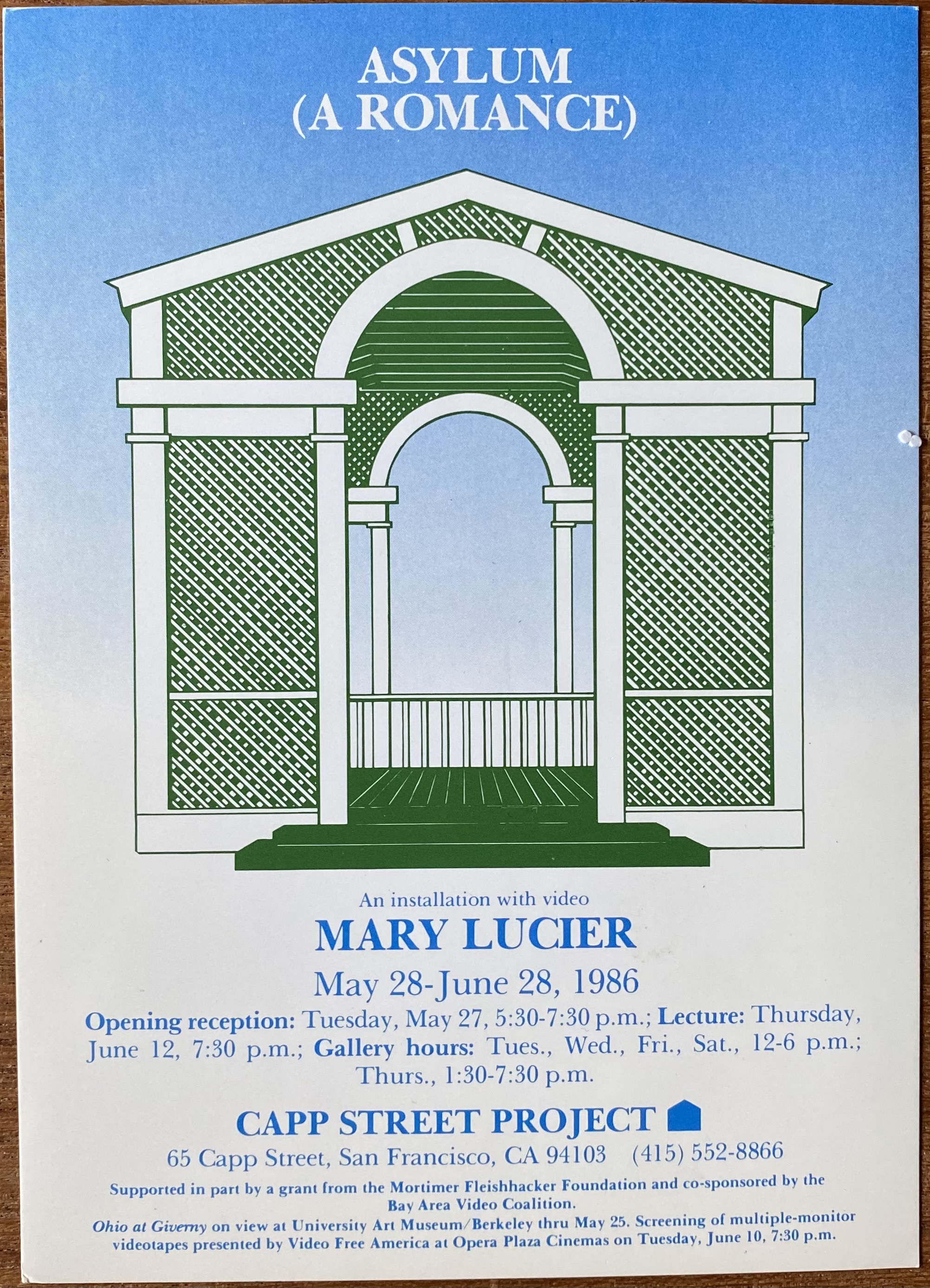 (Mary Lucier). Asylum (A Romance). An installation with video by Mary Lucier. Capp Street Project, San Francisco, May 28 – June 28, 1986