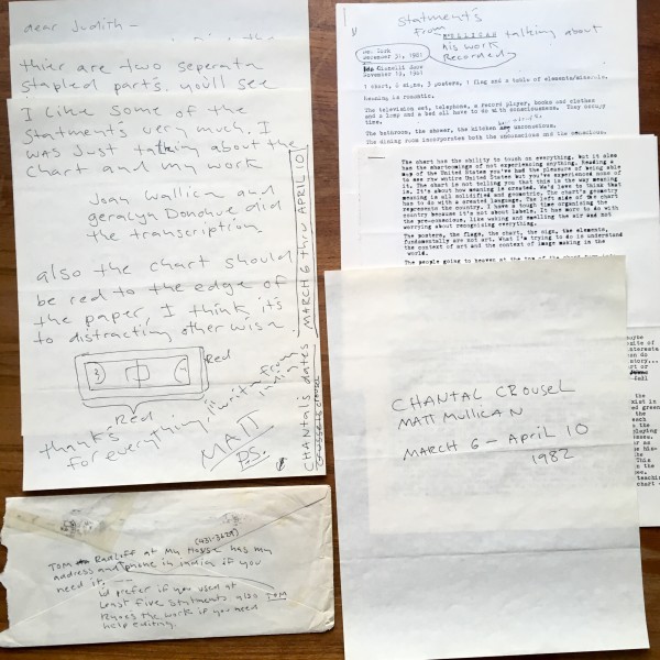 Matt Mullican. Statements from Mullican talking about his work recorded in New York, December 31, 1981. Typescript (photocopy with 1 pencil addition). 5 sheets (i.e. pages) stapled in upper left corner, 11 x 8 1/2” / 27.8 x 21.5cm each