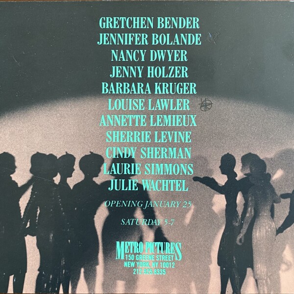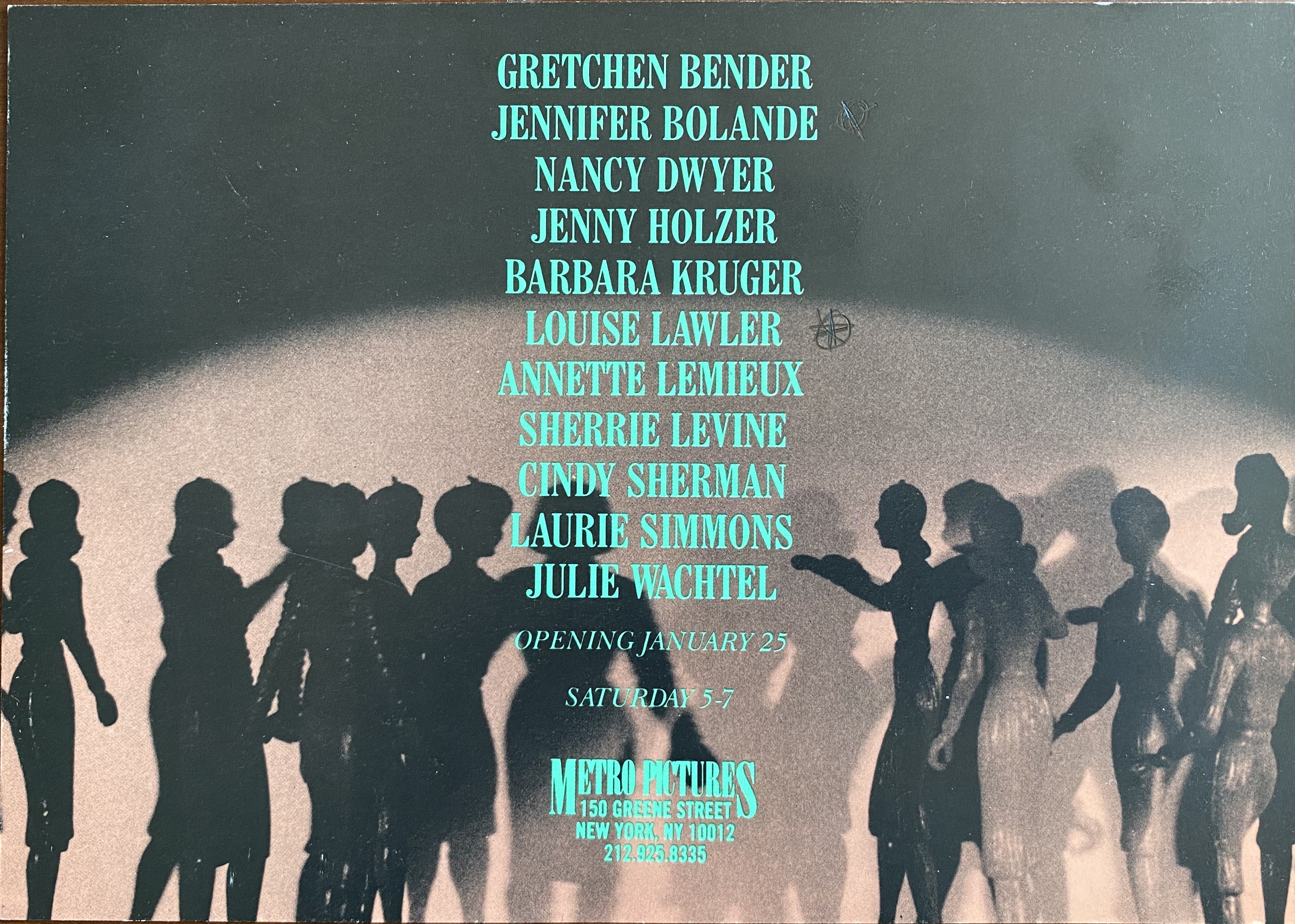 Categories: Announcements, New York art world, Women artists Tags: Annette Lemieux, Barbara Kruger, Cindy Sherman, Gretchen Bender, Jennifer Bolande, Jenny Holzer, Julie Wachtel, Laurie Simmons, Louise Lawler, Metro Pictures, Nancy Dwyer, Sherrie Levine
