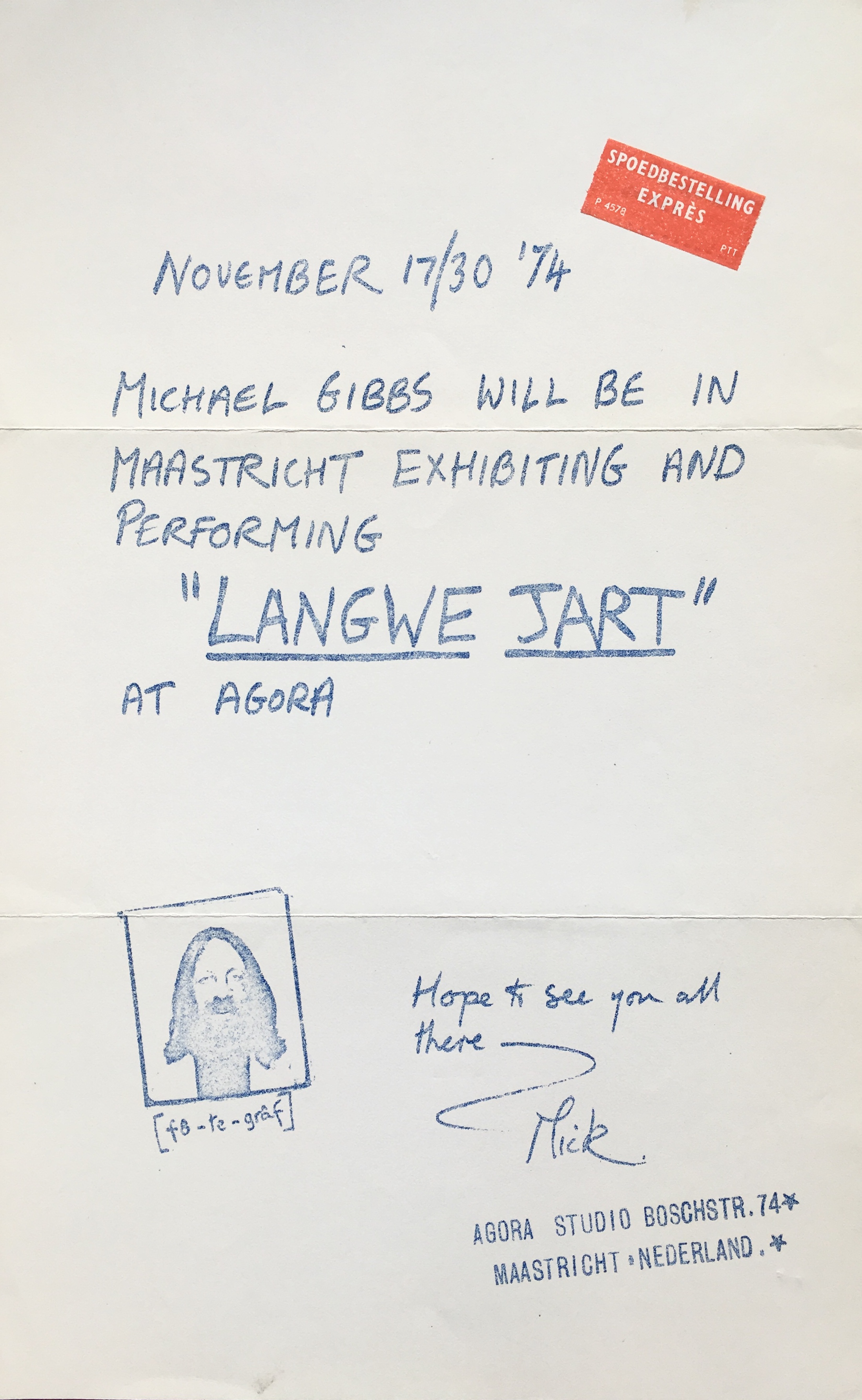 (Michael Gibbs). Michael Gibbs will be in Maastricht exhibiting and performing “LANGVE JART” at Agora. Agora Studio, Maastricht, November 17 – 30, 1974