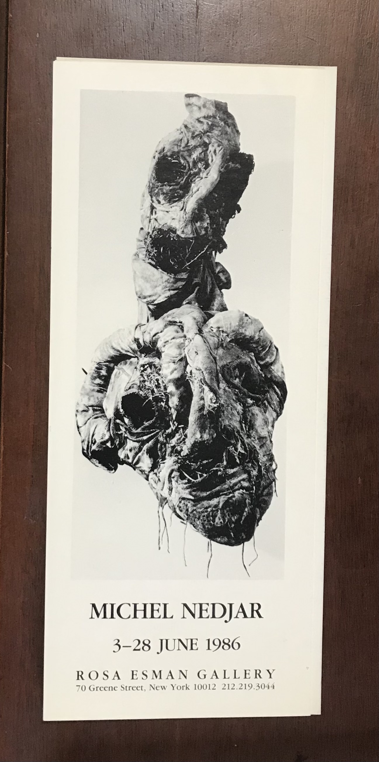 Michel Nedjar. Paintings, Releifs, Sculpture. Rosa Esman Gallery, New York, Jun 4-July 7, 1987. Illustrated announcement card. 4 x 9-1/16″ / 9.8 x 23 cm