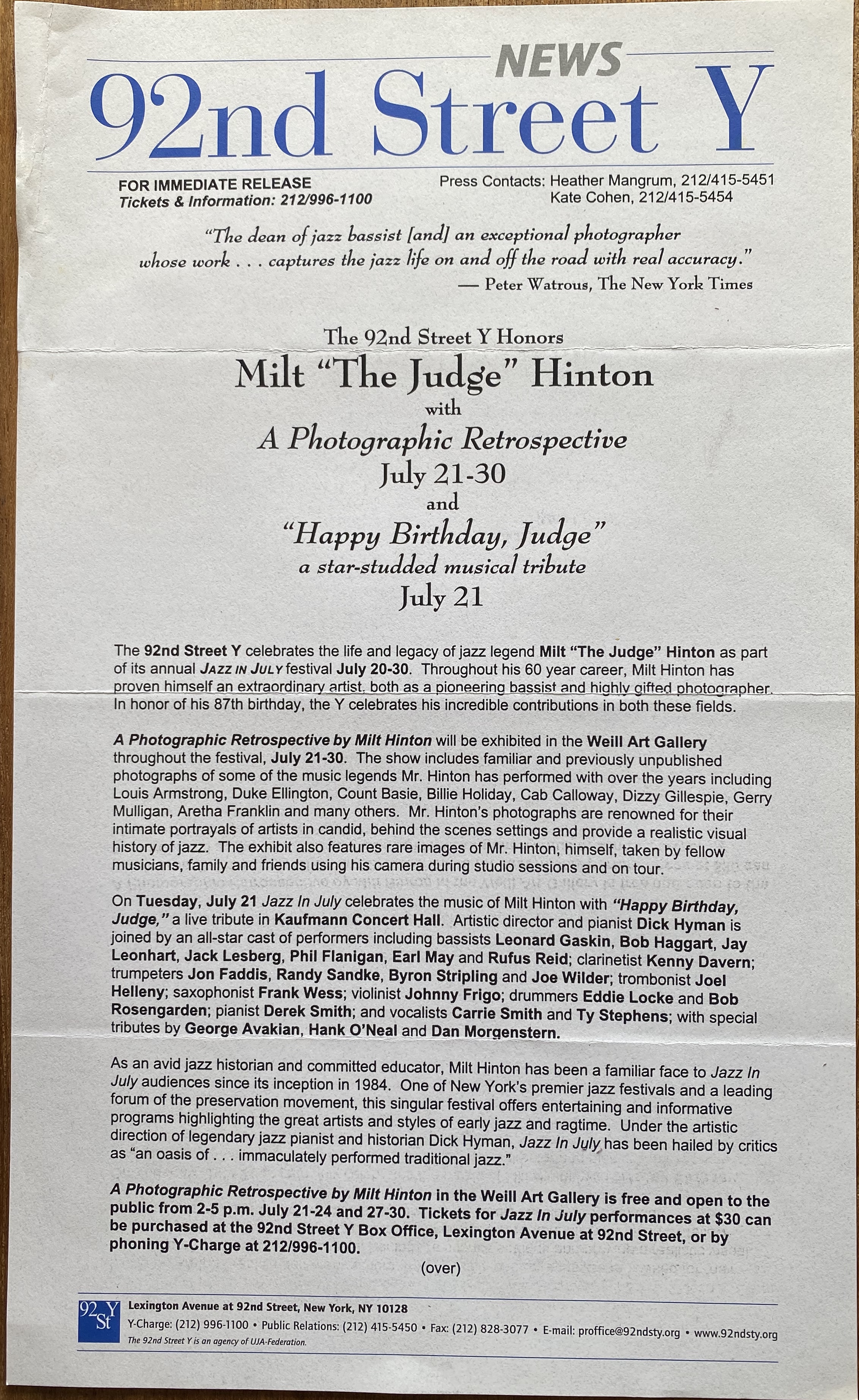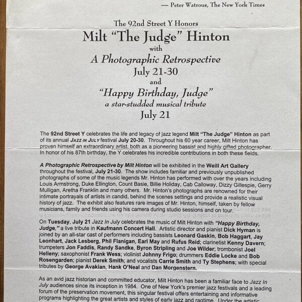 (Milt Hinton). The 92nd Street Y Honors Milt “The Judge” Hinton with A Photographic Retrospective, July 21-30, and “Happy Birthday Judge” a star-studded musical tribute, July 21, [1998]