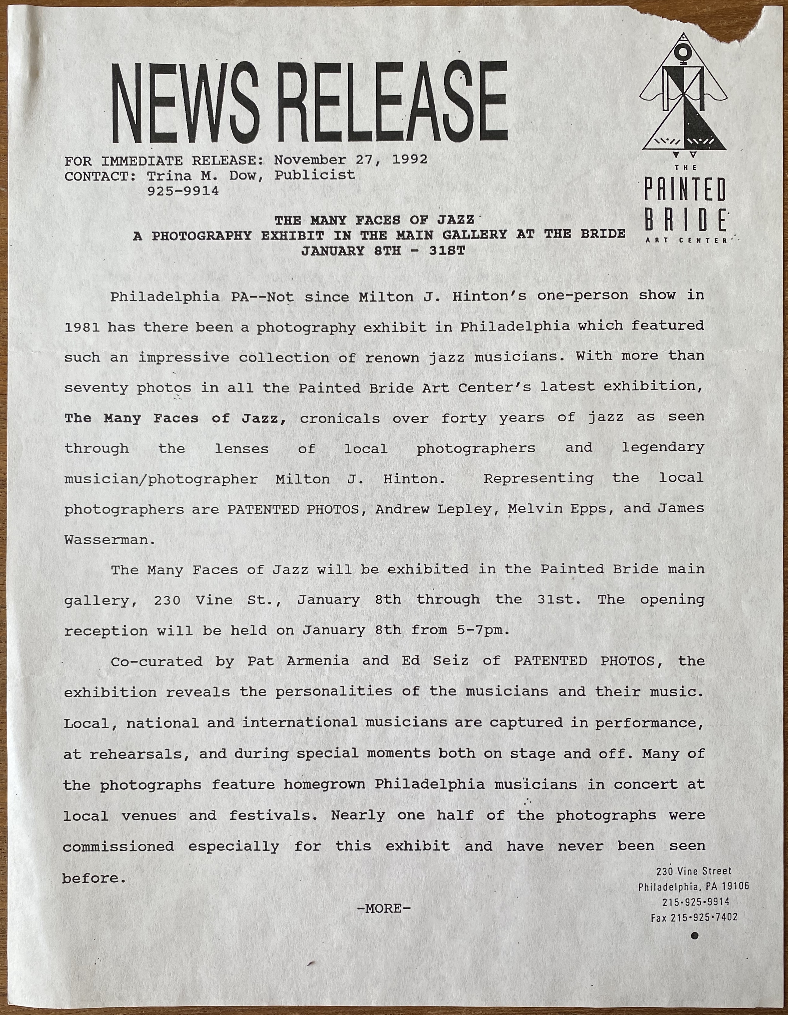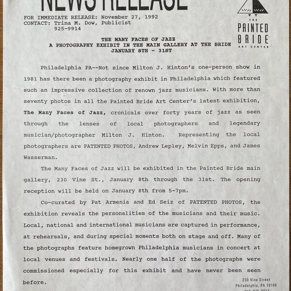 (Milt Hinton). The Many Faces of Jazz: A Photography Exhibit in the Main Gallery at the Bride January 8th-31st, The Painted Bride, Philadelphia, Pennsylvania, January 8-31, 1993