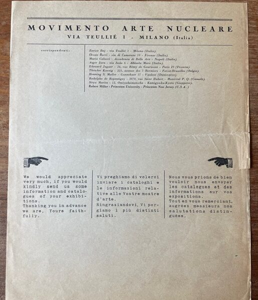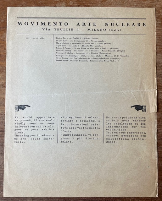 Movimento Arte Nucleare. We would appreciate very much… / Vi preghiamo di volerci… / Nous vous prions de bien vouloir… Milano, no date