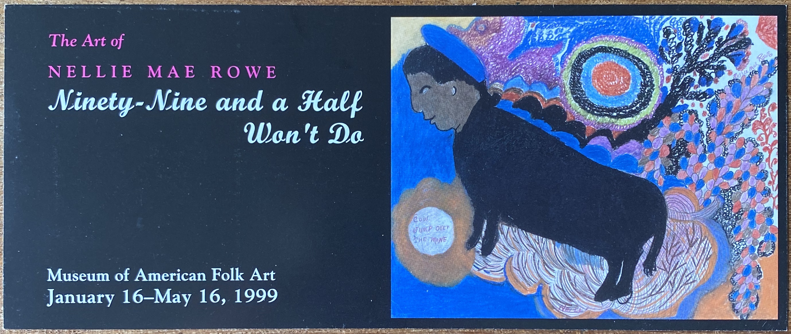 (Nellie Mae Rowe). The Art of Nellie Mae Rowe: Ninety-Nine and a Half Won’t Do. The Museum of American Folk Art, New York, January 20, 1999