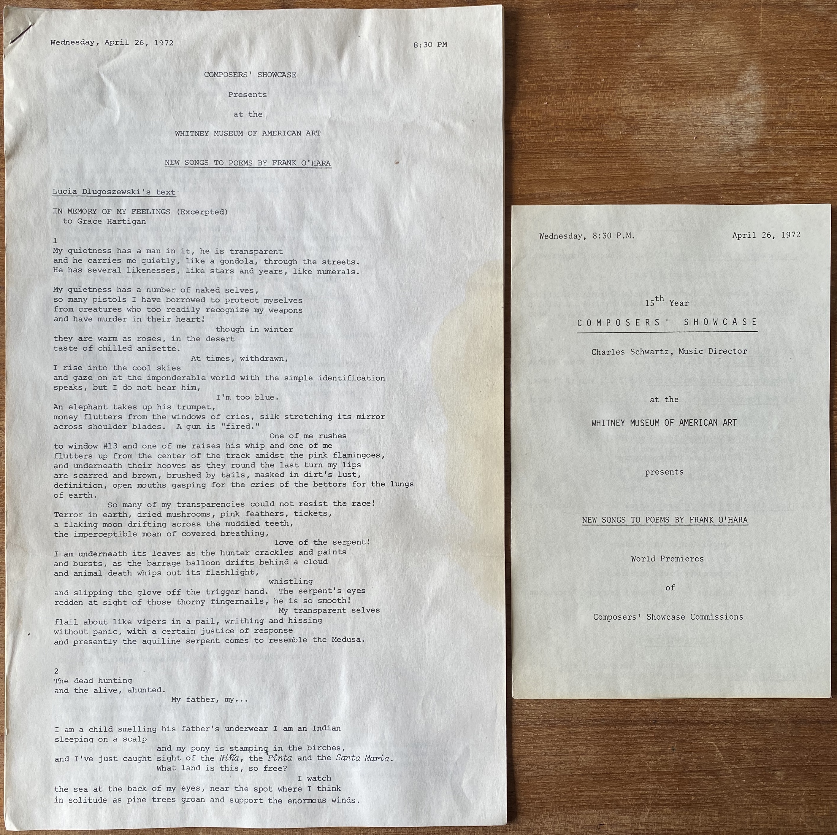New songs to poems by Frank O’Hara. Whitney Museum of American Art, [New York], April 26, 1972.