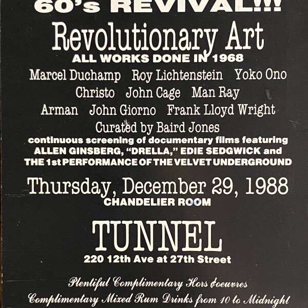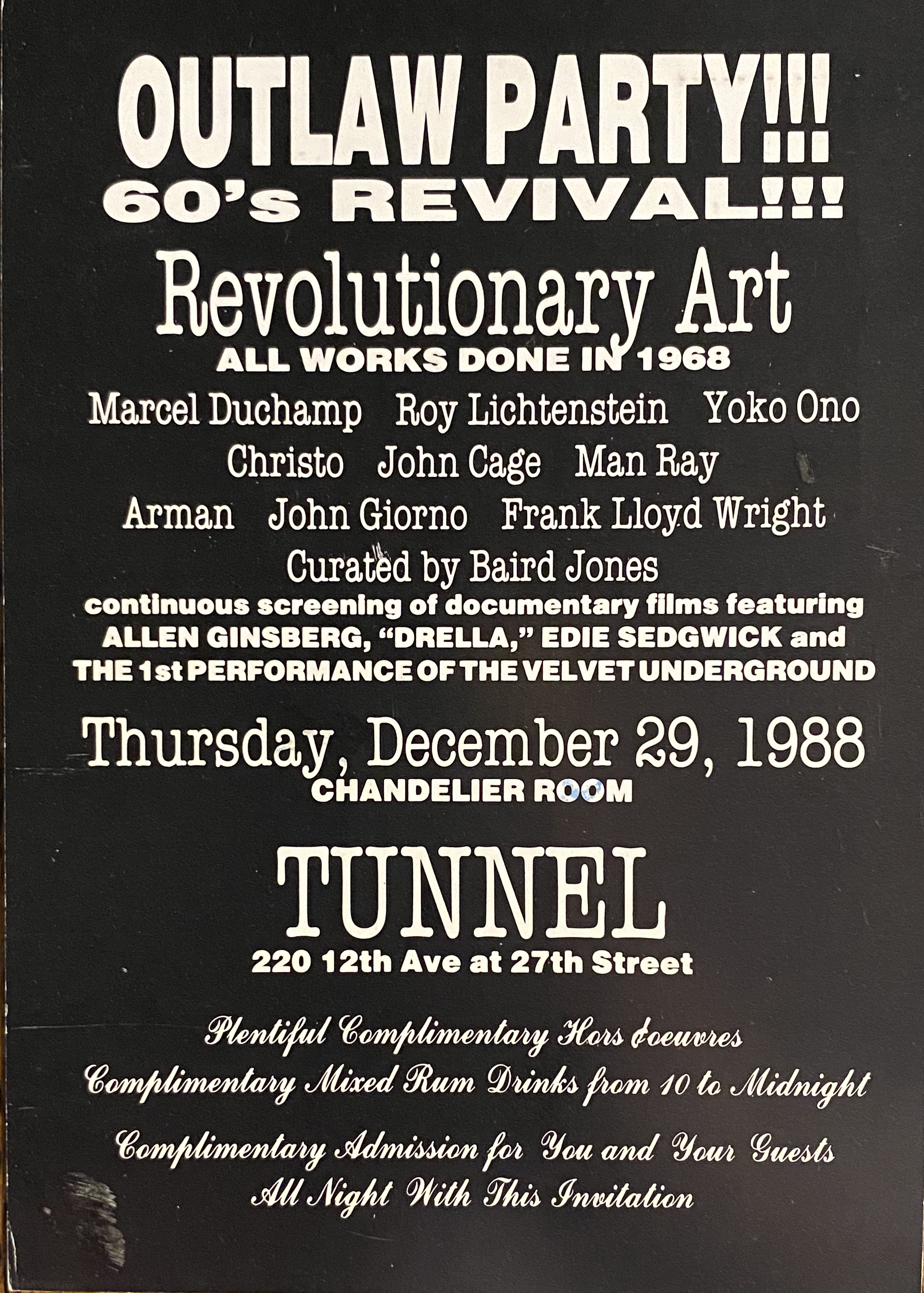 Outlaw Party!!! 60’s Revival / Revolutionary Art. All works done in 1968. Curated by Baird Jones. Tunnel, New York, December 29, 1988