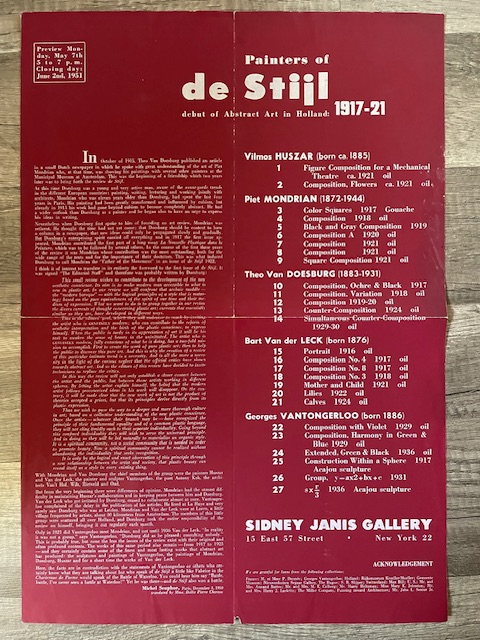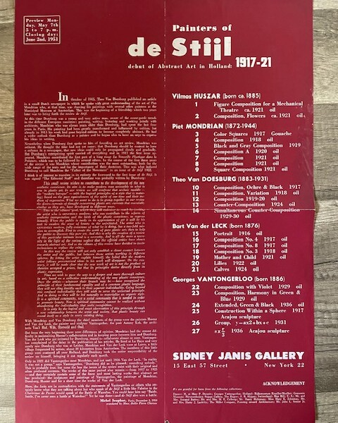 Painters of de Stijl / Debut of Abstract Art in HOlland: 1917-1921. Sidney Janis Gallery, New York, May 7 – June 2, 1951