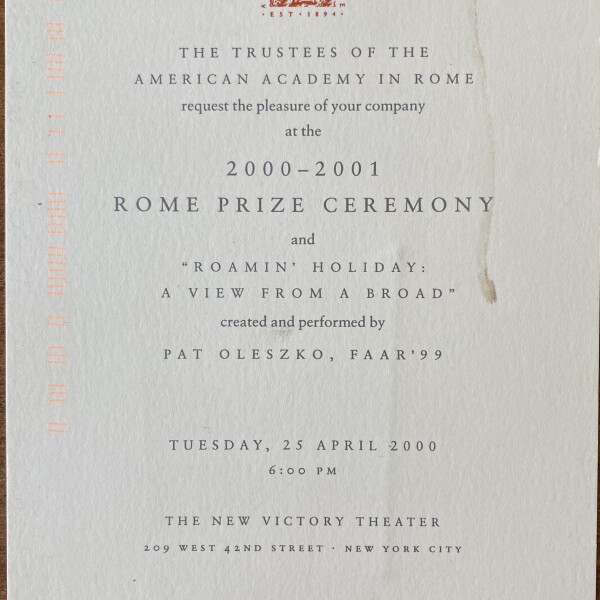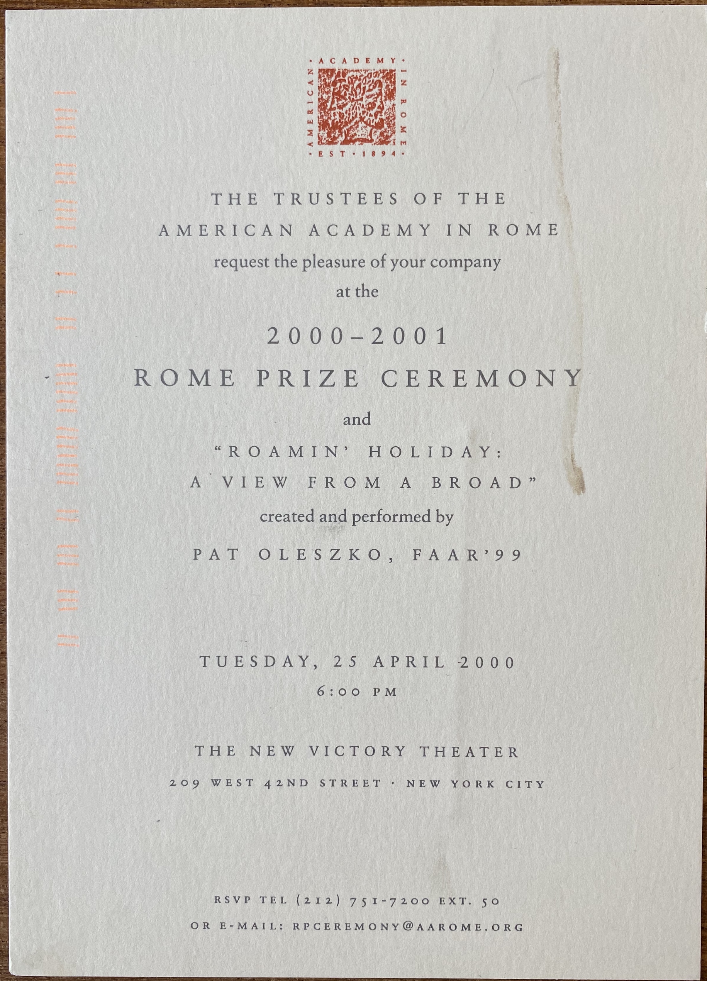 (Pat Oleszko). 2000-2001 Rome Prize Ceremony and “Roamin’ Holiday: A View from a Broad” created and performed by Pat Oleszko. The New Victory Theater, New York, 25 April 2000