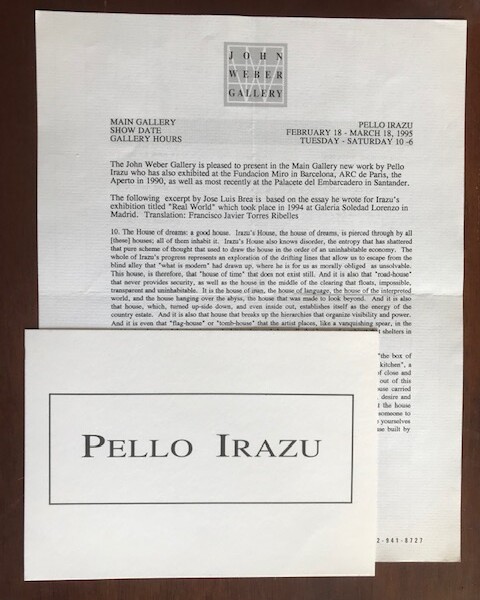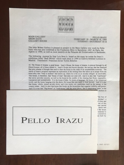 (Pello Irazu). Pello Irazu. John Weber Gallery, New York, February 18-March 18, 1995