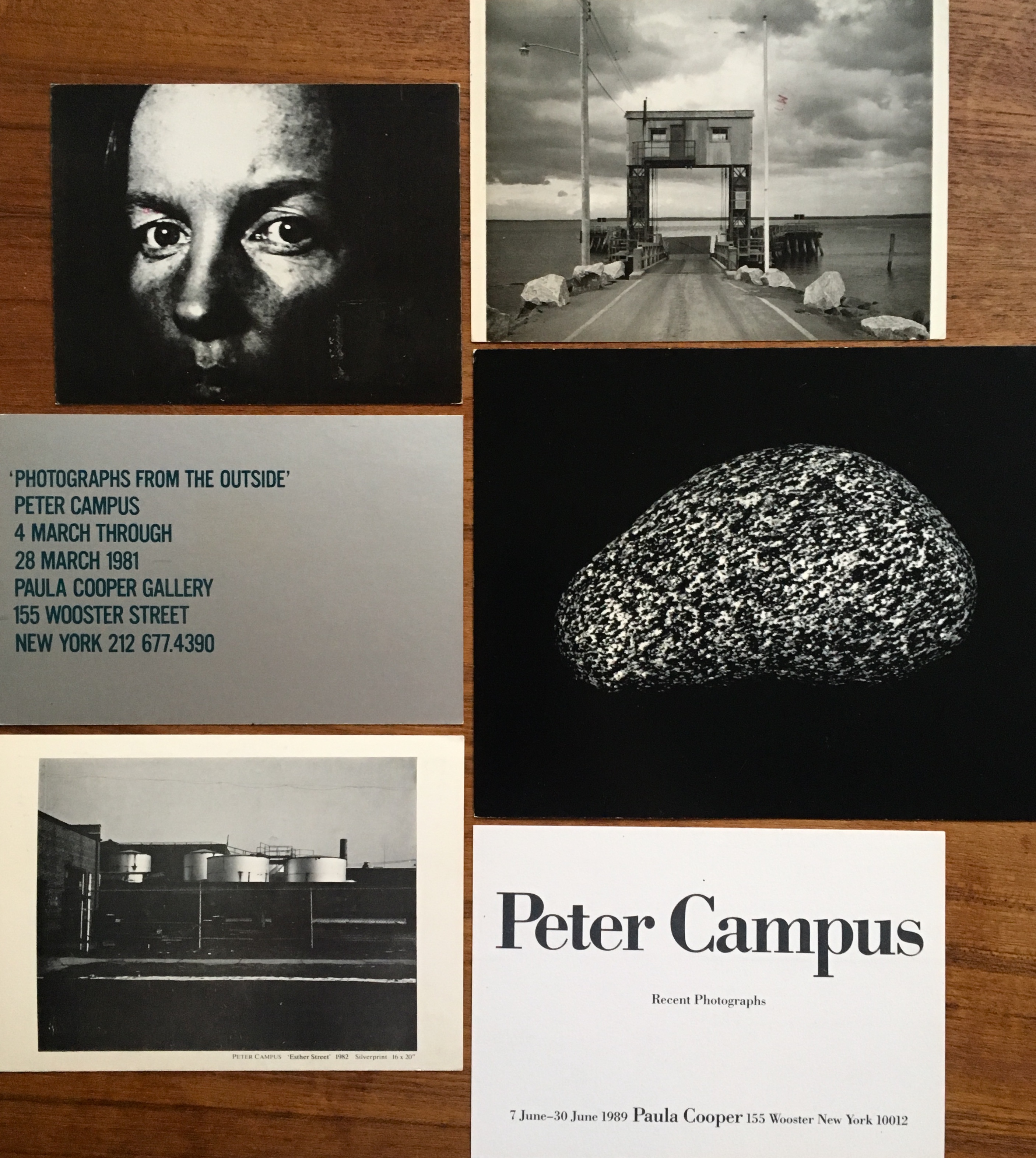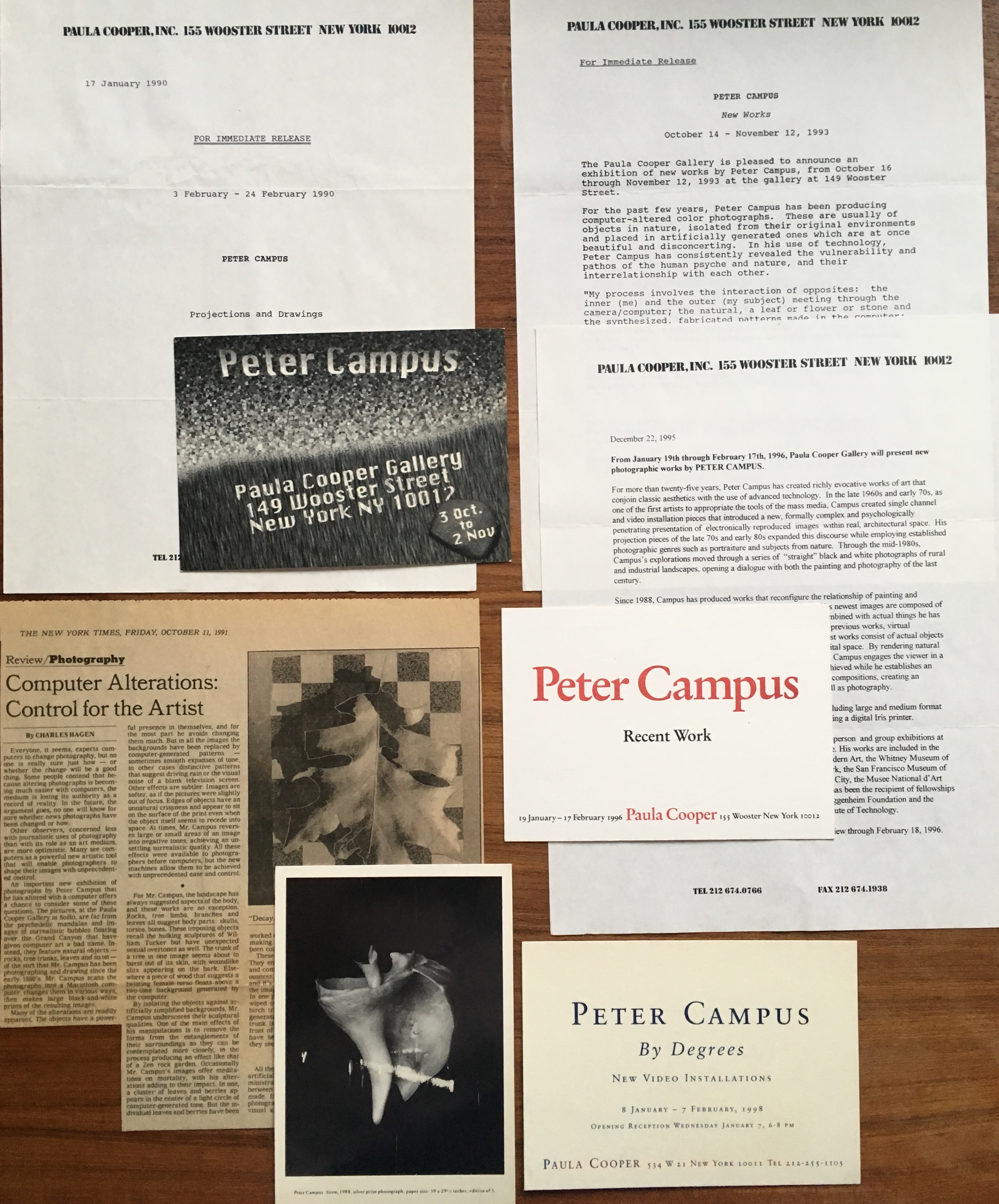 (Peter Campus). Peter Campus at Paula Cooper, New York: 10 announcement cards and 3 press release, 1979 – 1998, and 1 review