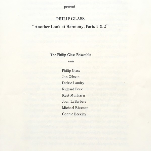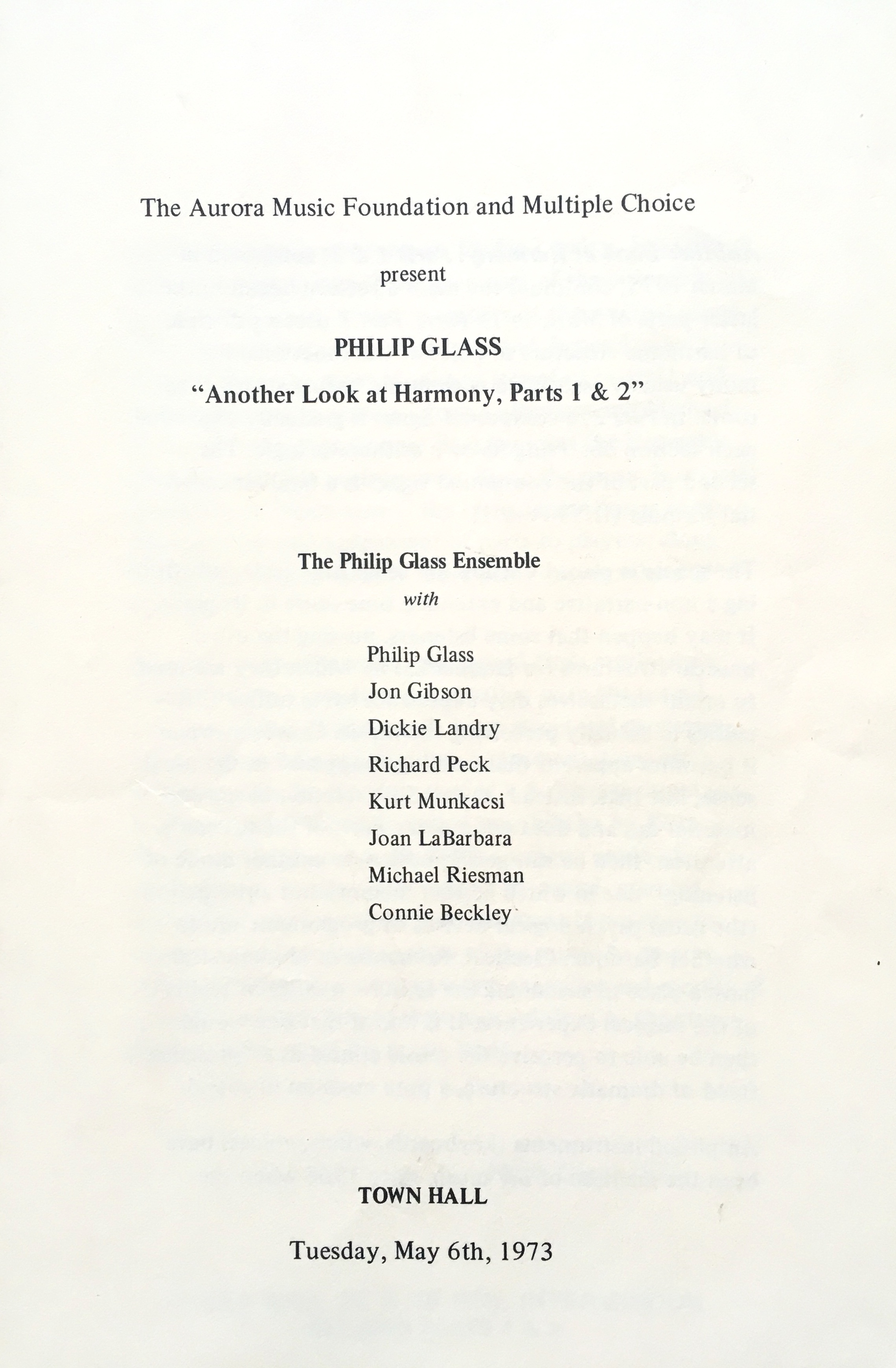 Philip Glass. “Another look at harmony, Parts 1 & 2.” Town Hall, [New York], May 6, 1973 [sic, i.e. 1975]
