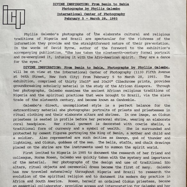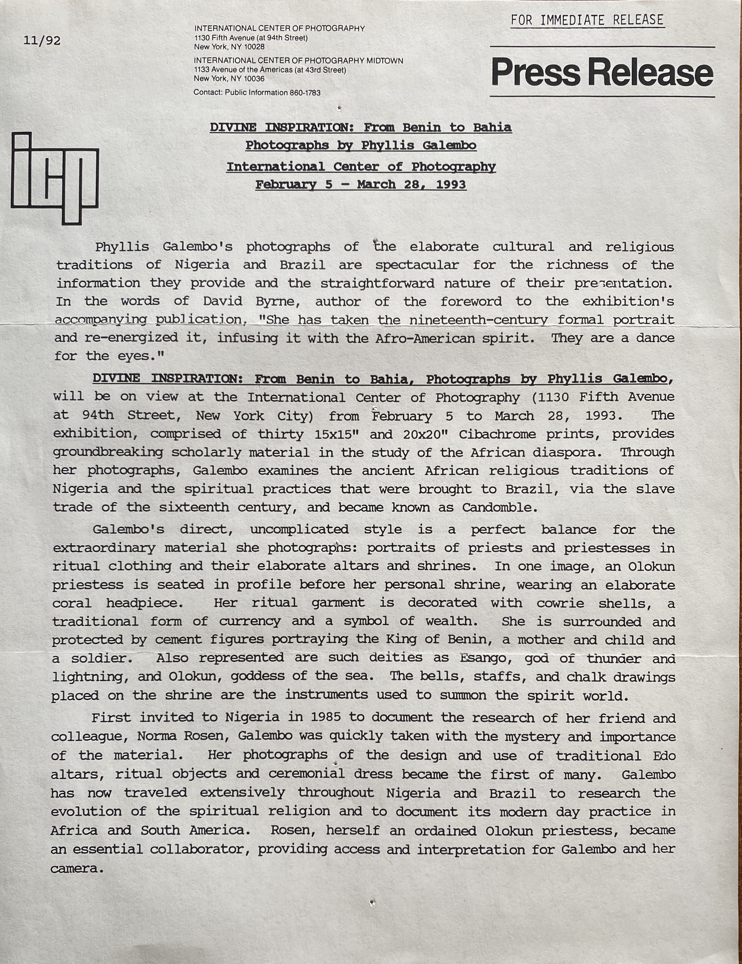 (Phyllis Galembo). Divine Inspiration: From Benin to Bahia. Photographs by Phyllis Galembo. International Center of Photography, [New York], February 5 – March 28, 1993
