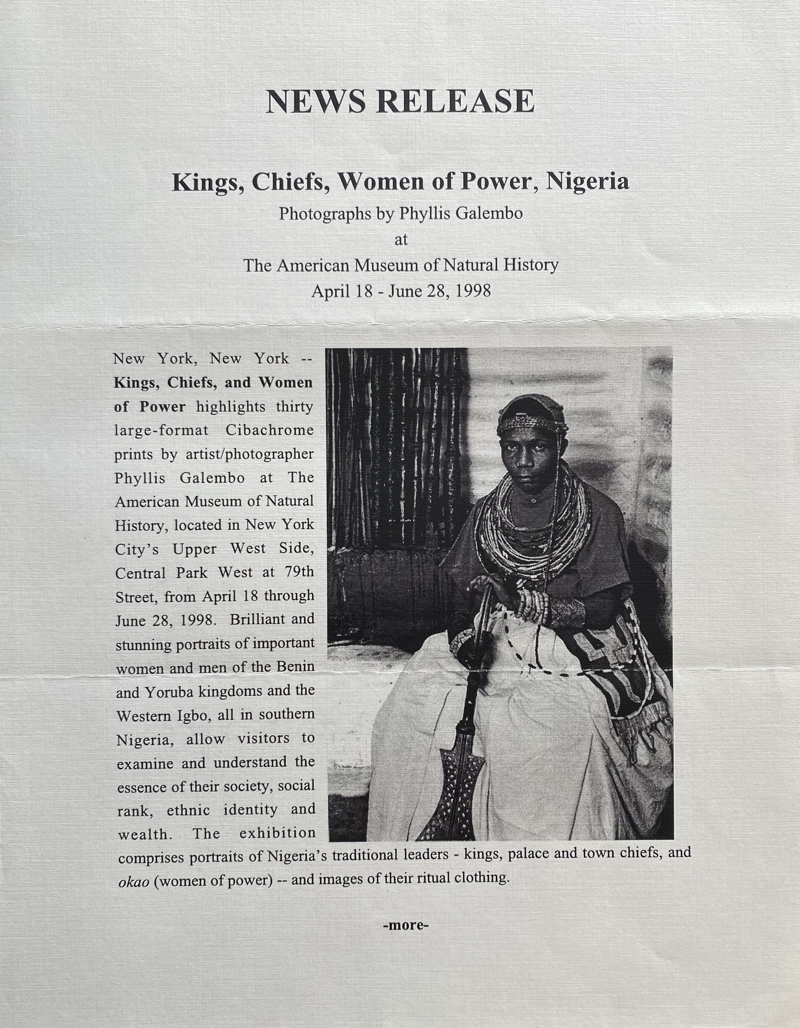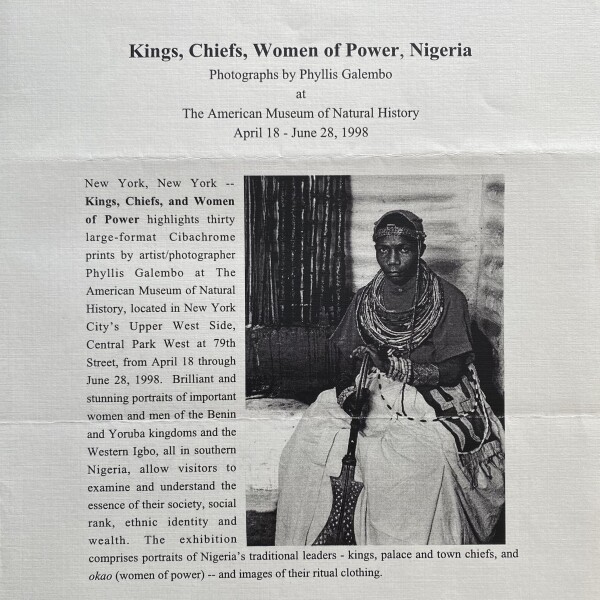 (Phyllis Galembo). Kings, Chiefs, Women of Power, Nigeria. Photographs by Phyllis Galembo. The American Museum of Natural History, April 18 – June 28, 1998
