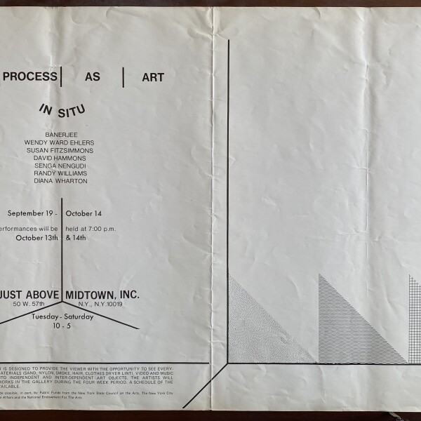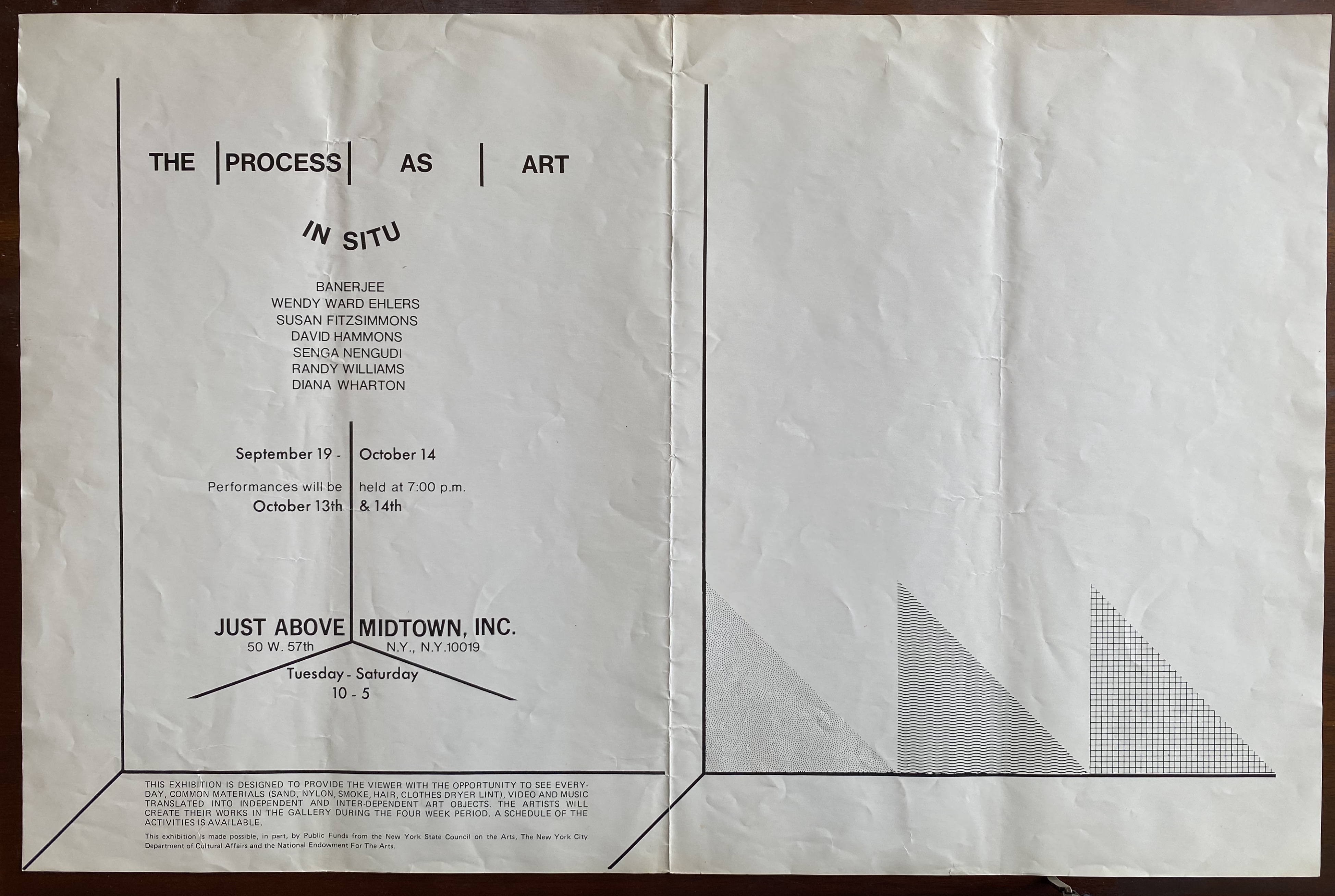 The Process as Art in Situ. Banerjee, Wendy Ward Ehlers, Susan Fitzsimmons, David Hammons, Senga Nengudi, Randy Williams, Diana Wharton. Just Above Midtown, New York, September 19 – October 14, 1979