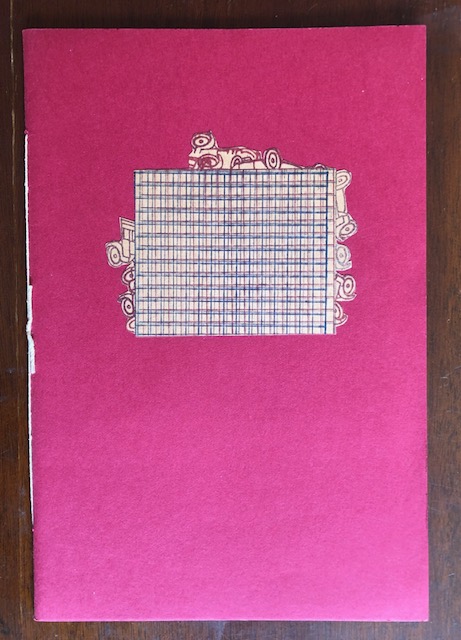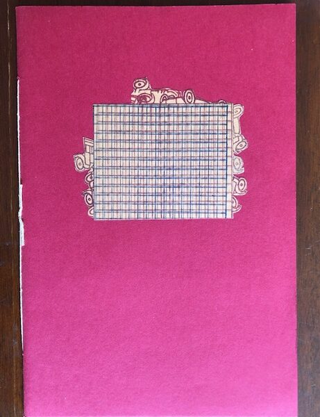 8-3/4 x 5-5/8″ / 22.9 x 14.2 cm, stitched to a 16-1/16 x 9-1/16″ / 23 x 15.4 cm light card stock rasberry red colder collaged with a rubber stamp work on paper.