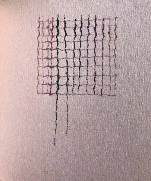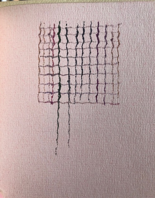 Rubber-stamped color grids on pink paper