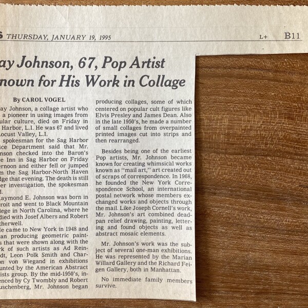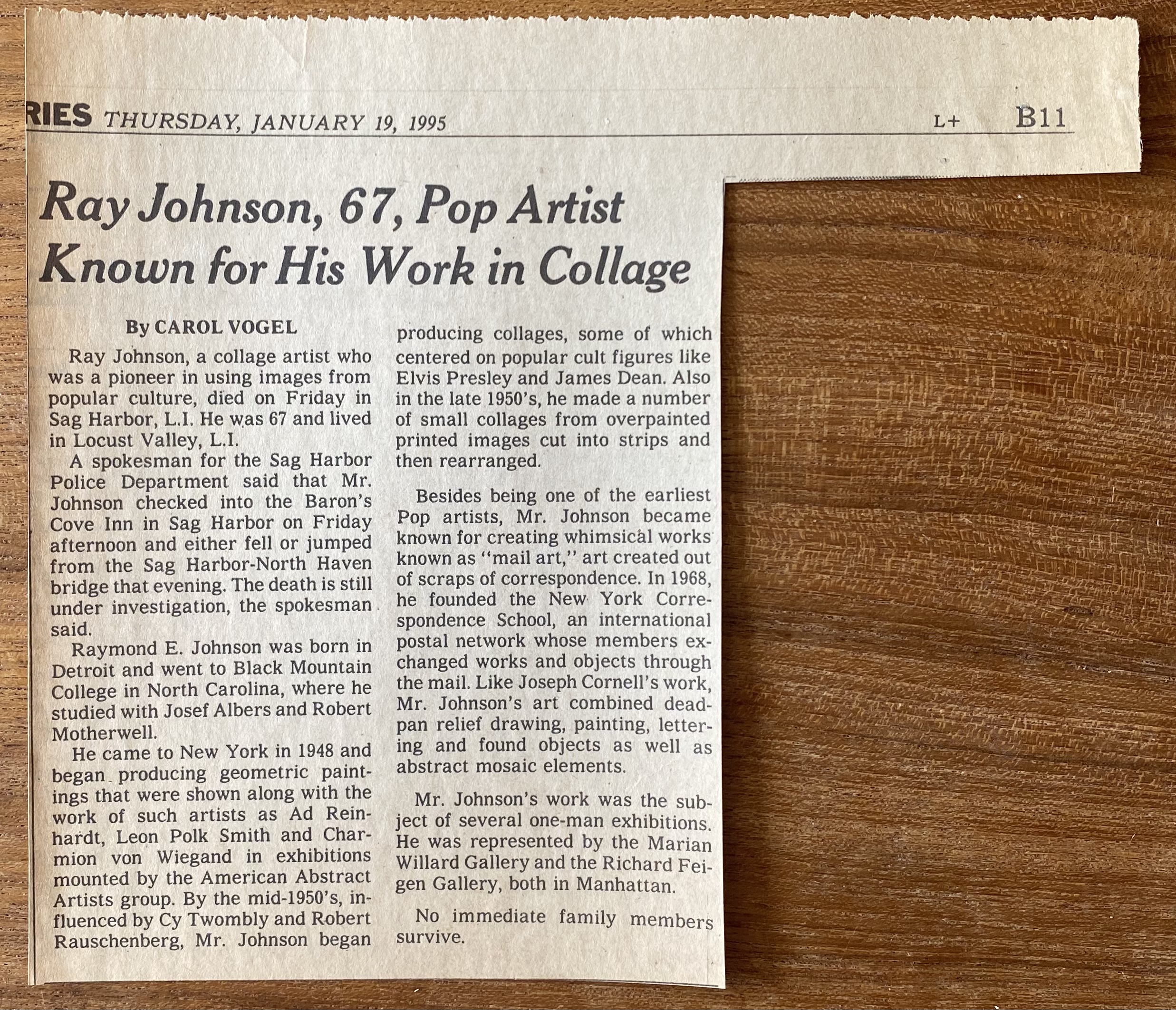 (Ray Johnson). Carol Vogel. Ray Johnson, 67, Pop Artist Known for His Works in Collage. The New York Times, January 19, 1995, page B11. Clipping.