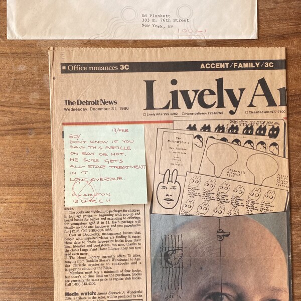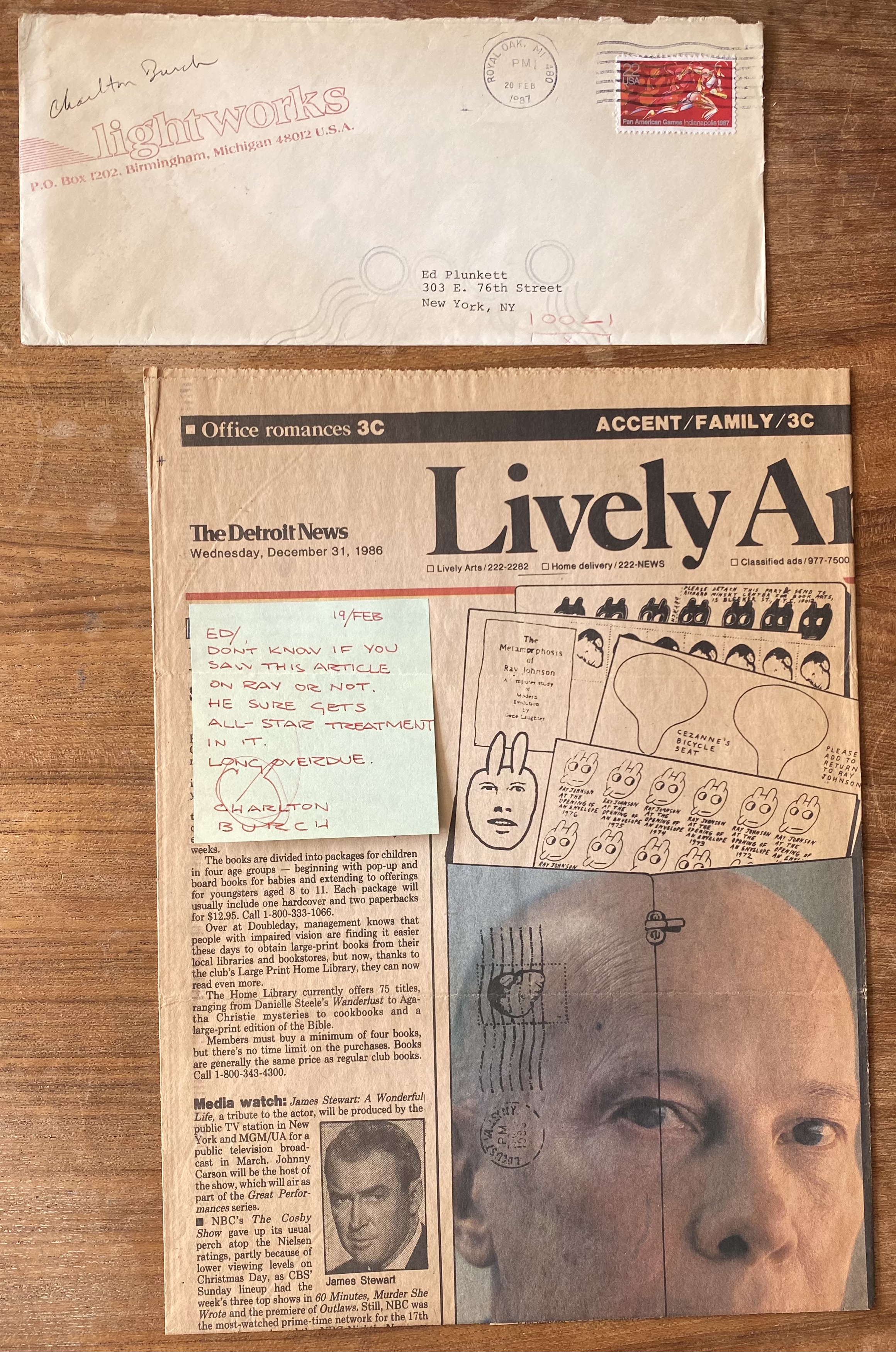 (Ray Johnson). Joy Hakanson Colby. This art is RSVP. The Detroit News, December 31, 1986. Section C front page and page 2C. Clipping.
