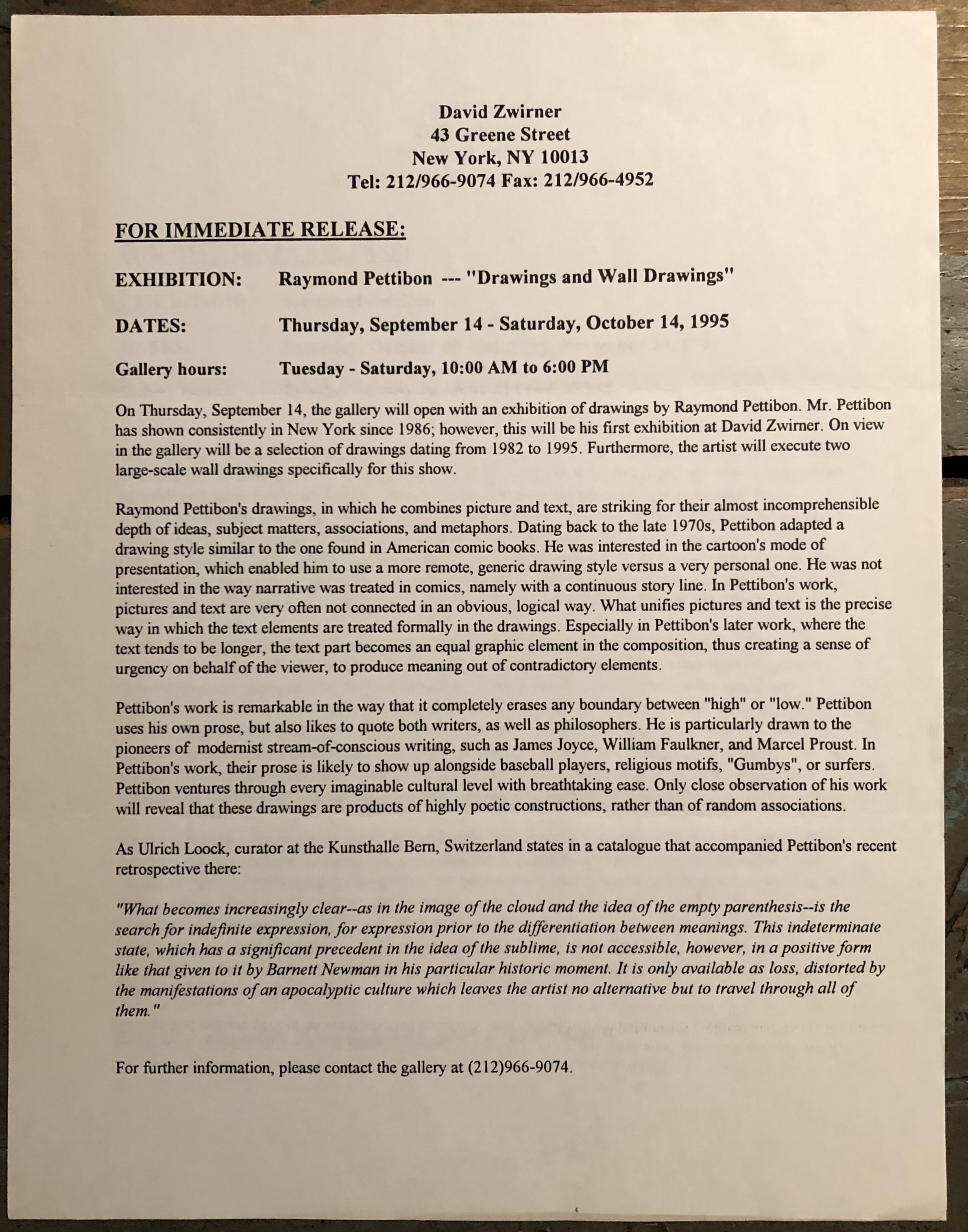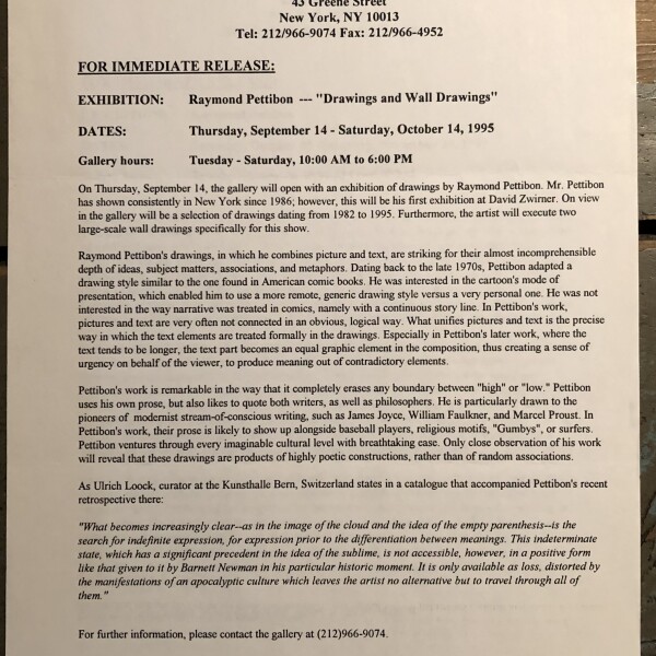 Raymond Pettibon. 2 press releases. David Zwirner, New York. 1 page each.