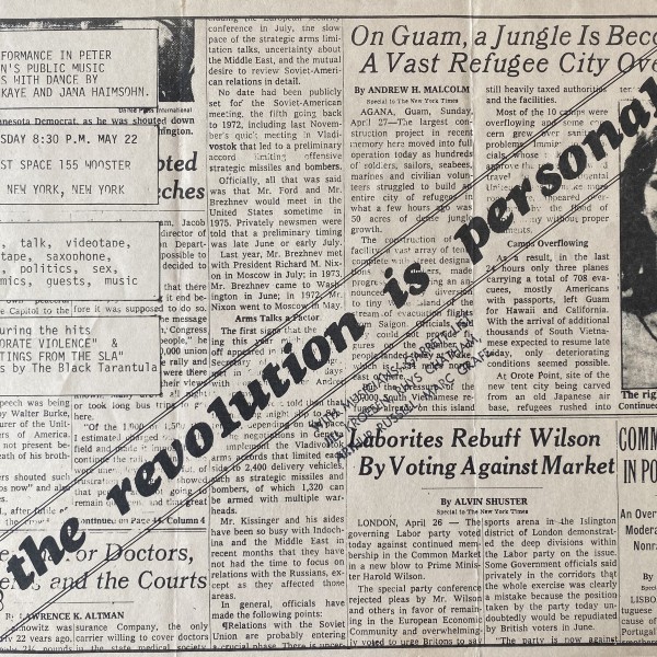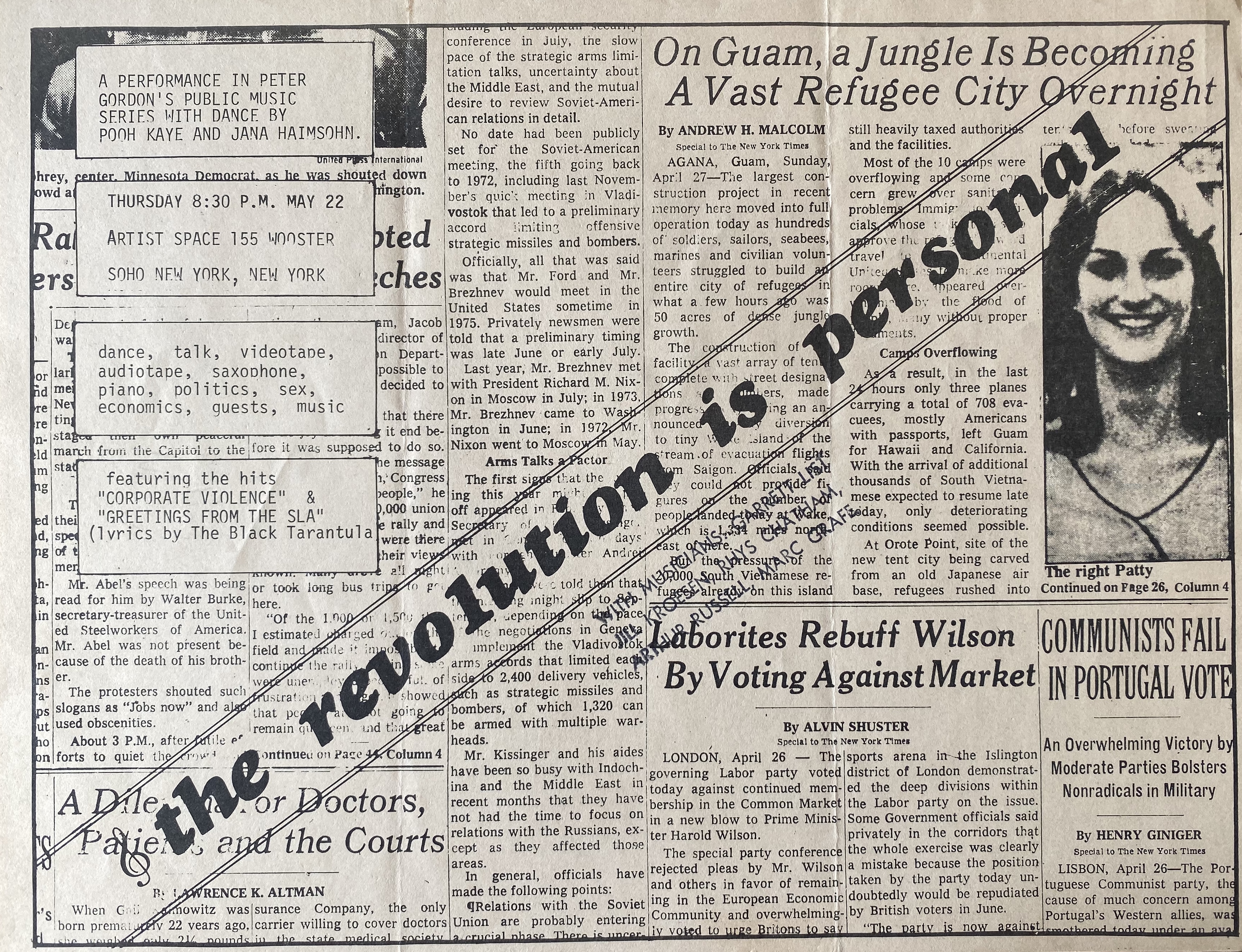 The revolution is personal. A performance in Peter Gordon’s Public Music series with dance by Pooh Kaye and Jana Haimsohn. Artist Space, New York, May 22, [1975]