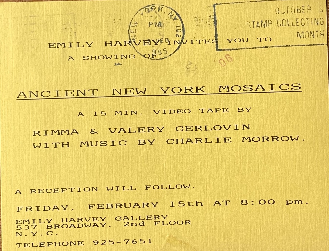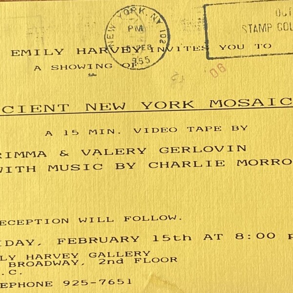 (Rimma Gerlovina / Valeriy Gerlovin). Ancient New York Mosaics. A 15min. video tape by Rimma & Valery Gerlovin, with music by Charlie Morrow, Emily Harvey Gallery, New York, February 15, 1985