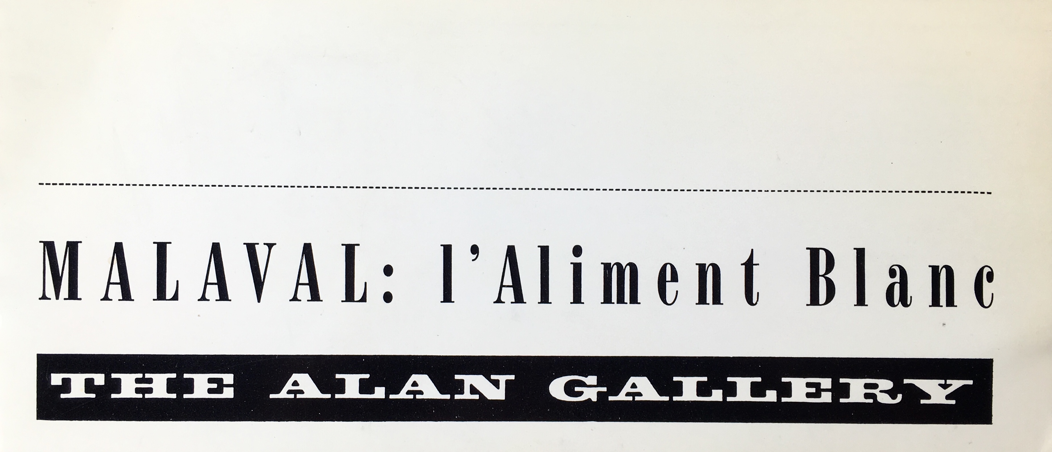 (Robert Malaval). Malaval: l’Aliment Blanc. The Alan Gallery, New York Drawings, Projects, Sculpture. The Alan Gallery, New York, October 19 – November 17, [1964]