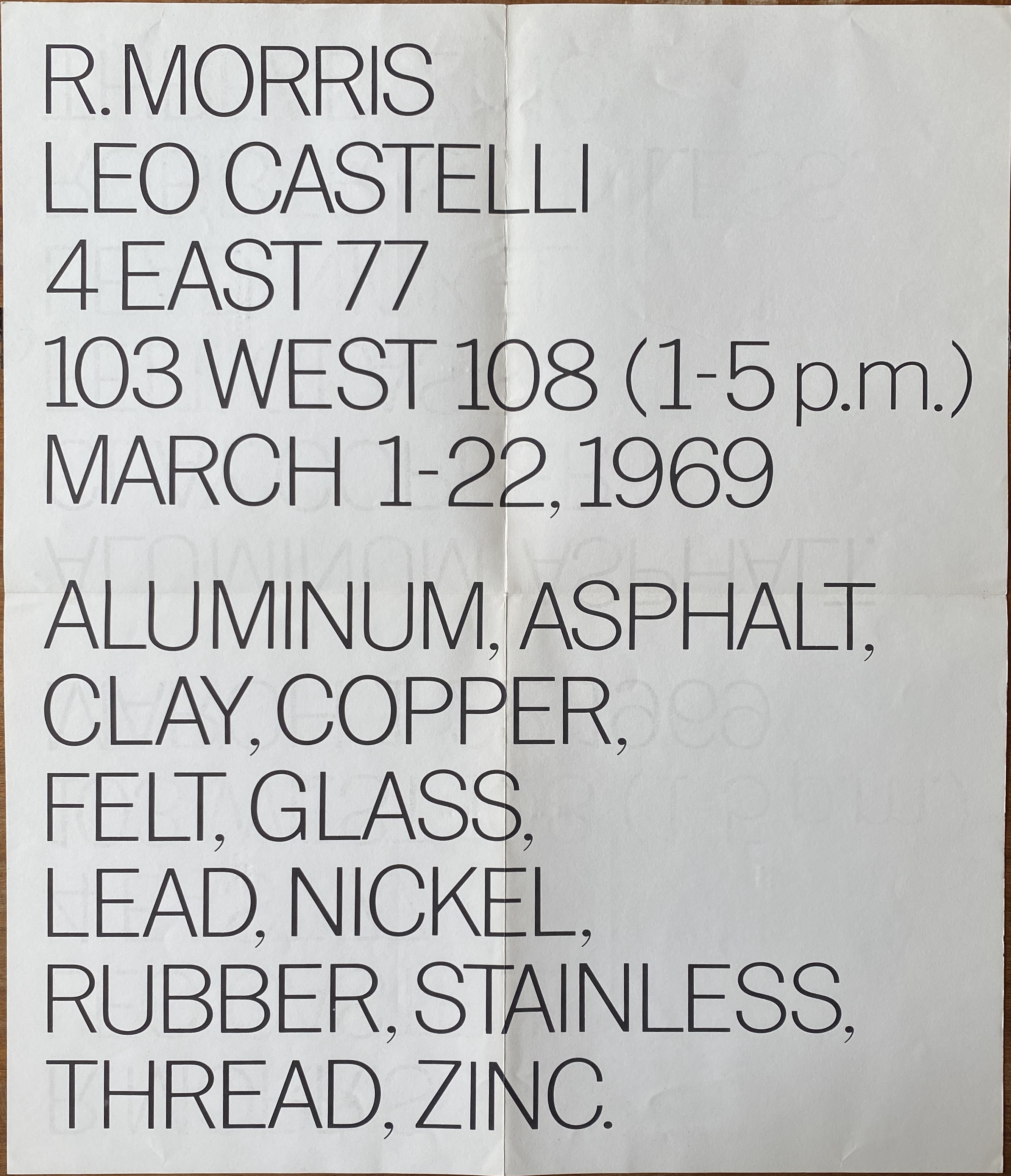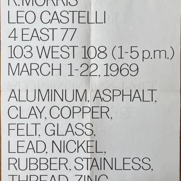 Robert Morris. Aluminum, Asphalt, Clay, Copper, Felt, Glass, Lead, Nickel, Rubber, Stainless, Thread, Zinc. Leo Castelli, New York, March 1-22, 1969