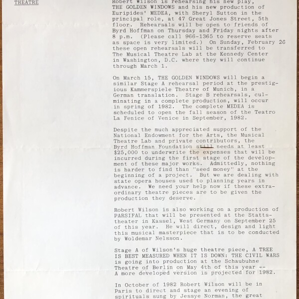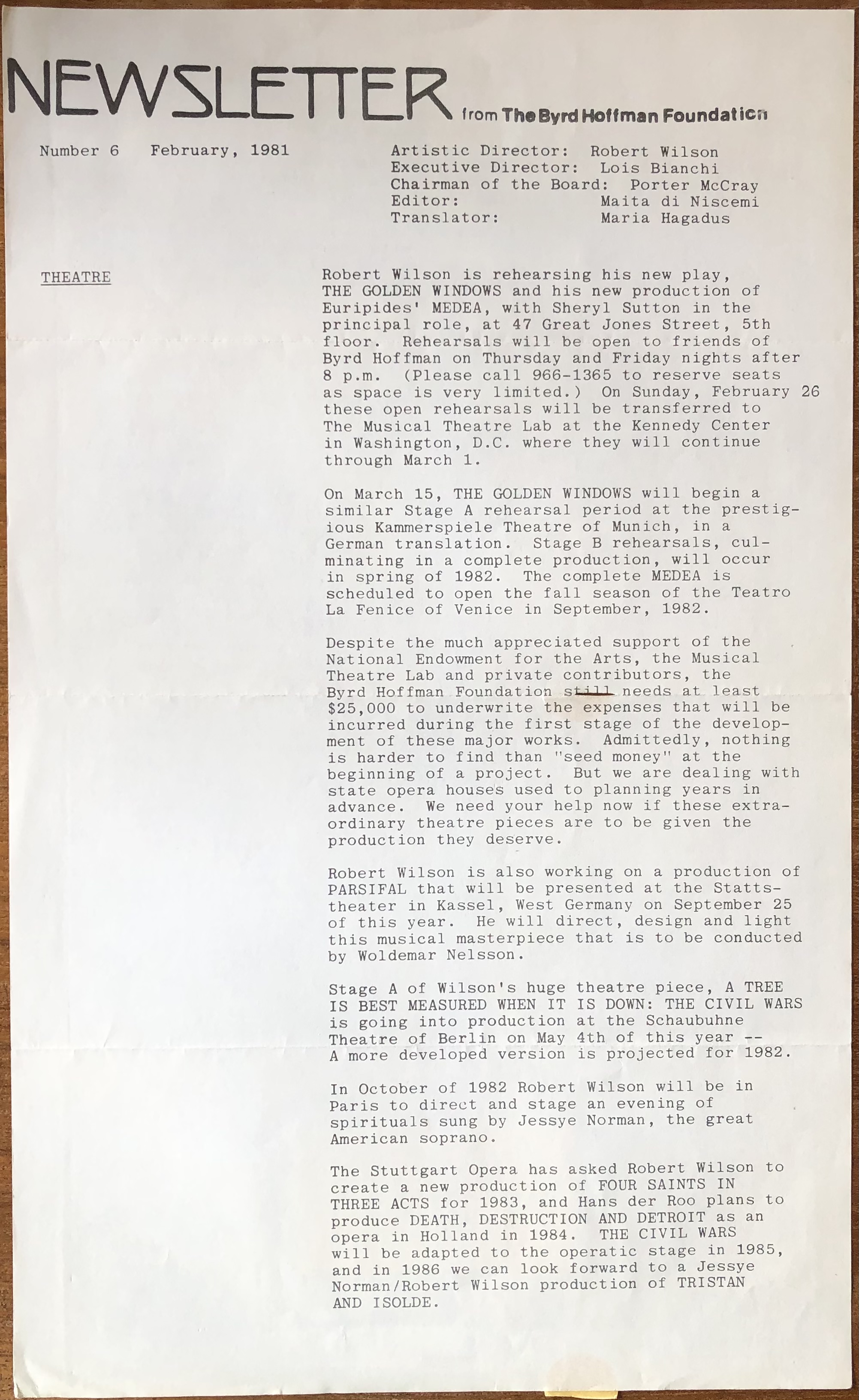 (Robert Wilson). Byrd Hoffman Foundation. Newsletter. Number 6. New York: February 1981
