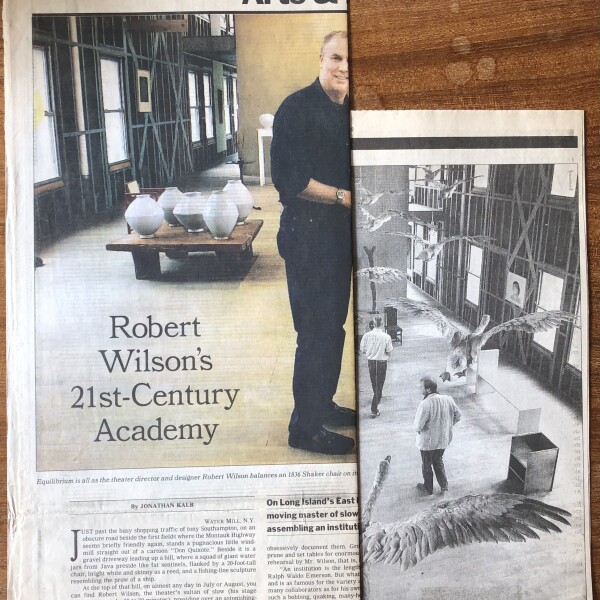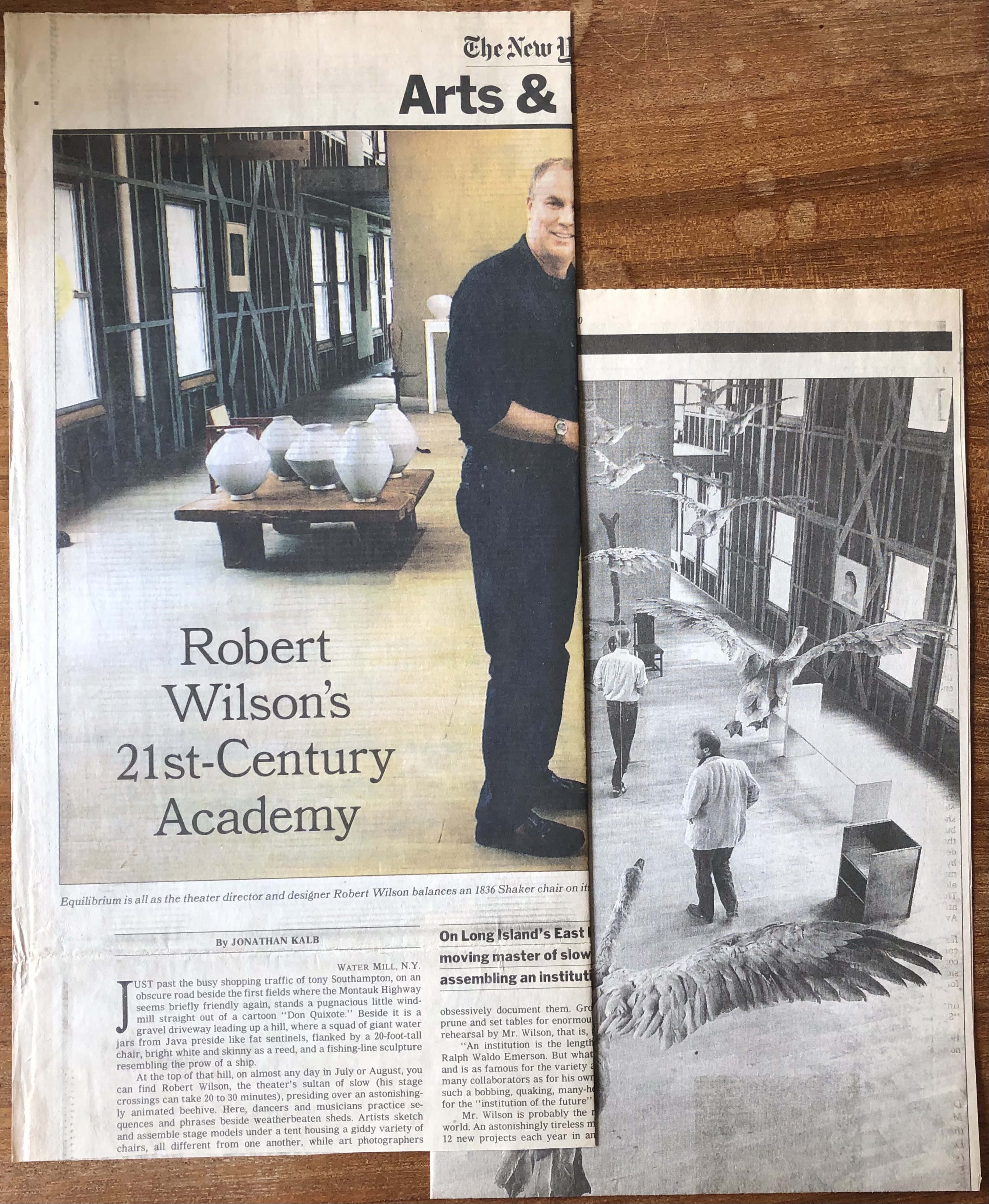 (Robert Wilson). Jonathan Kalb. Robert Wilson’s 21st – Century Academy. The New York TImes. August 13, 2000, pages 1,8 AR. Clipping.