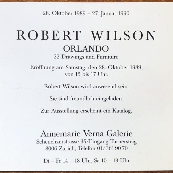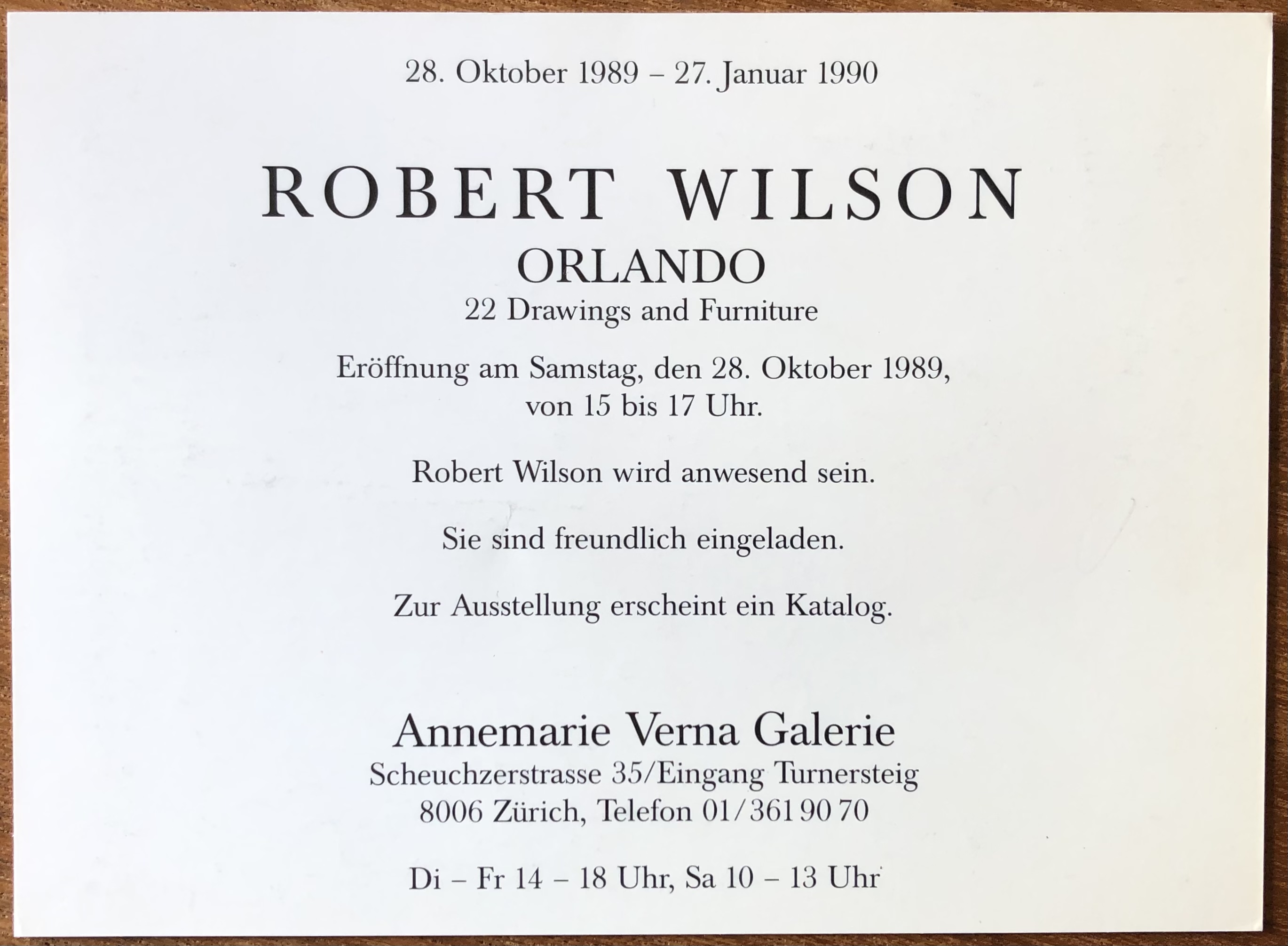 Robert Wilson. Orlando. 22 Drawings an Furniture. Annemarie Verna Galerie, Zürich, 28. Oktober 1989 – 27. Januar 1990