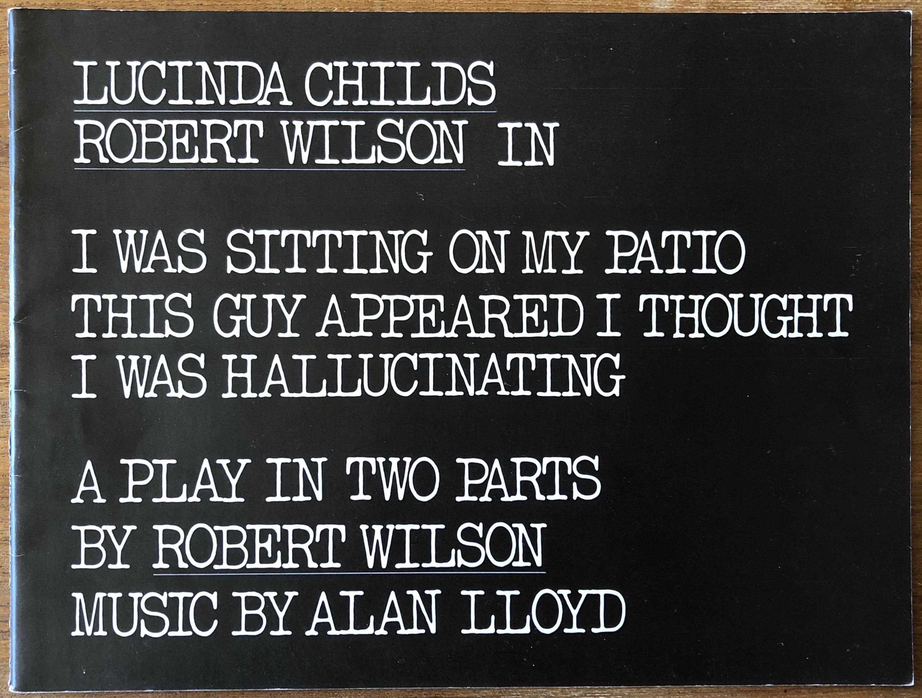 “Edition limited to 1000 copies specially printed by Michael White at the occasion of the performance at the Royal Court Theater, London, January 5 – 11, 1978” (verso of first unpaginated leaf). Performed there by Lucinda Childs and Robert Wilson with music by Alan Lloyd.