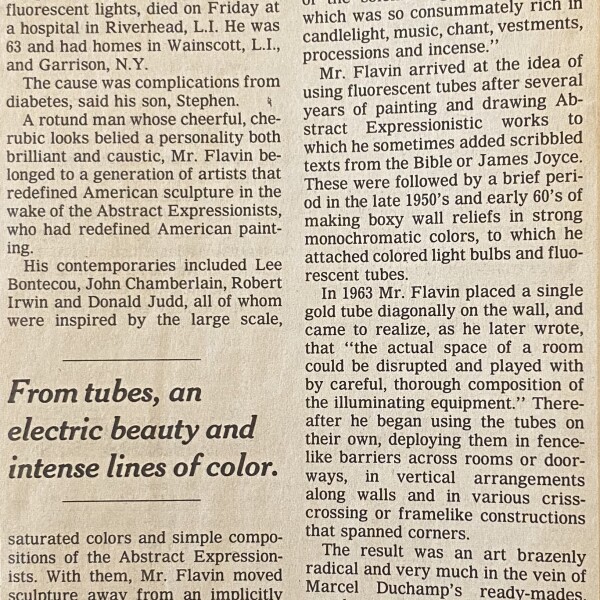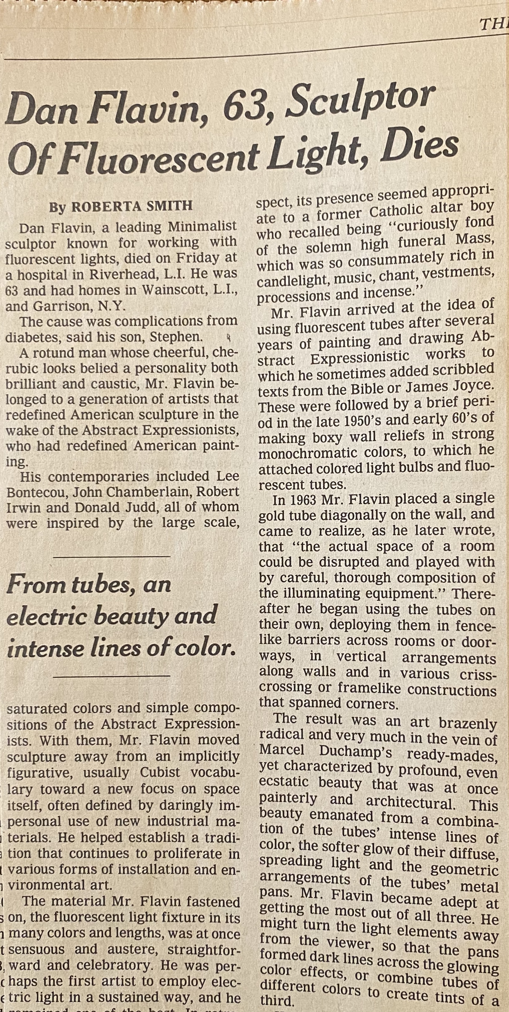 Roberta Smith. Dan Flavin, 63, Sculptor of Fluorescent Light, Dies. The New York Times, December 4, 1996